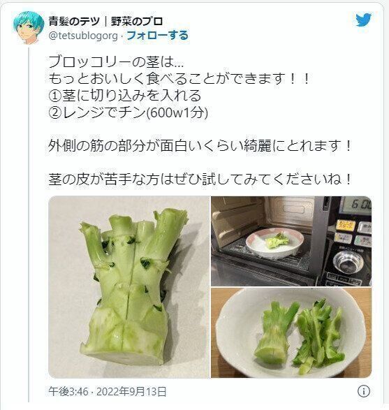 今回参考にしたツイートではブロッコリーの茎に切り込みを入れてレンジで加熱すると外側の筋が面白くらい綺麗に撮れる、という野菜の調理テクです。発信者の「青髪のテツ」さんは八百屋歴10年の経験を生かして、野菜や果物に関するお役立ち情報を発信しています。