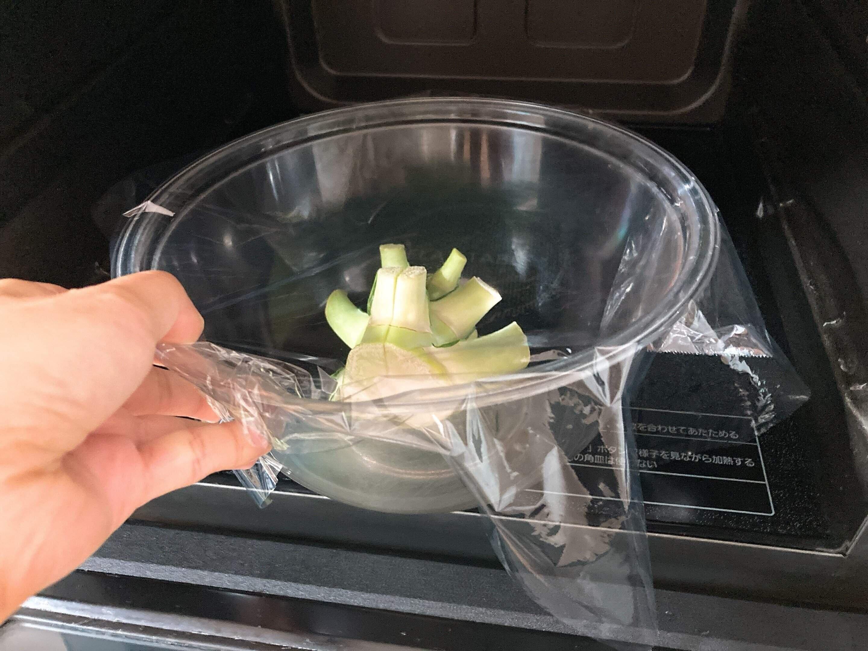 切り込みを入れた茎を耐熱容器に入れて、ラップをかけます。あとは電子レンジに入れて、600Wで1分ほど加熱をするだけ!