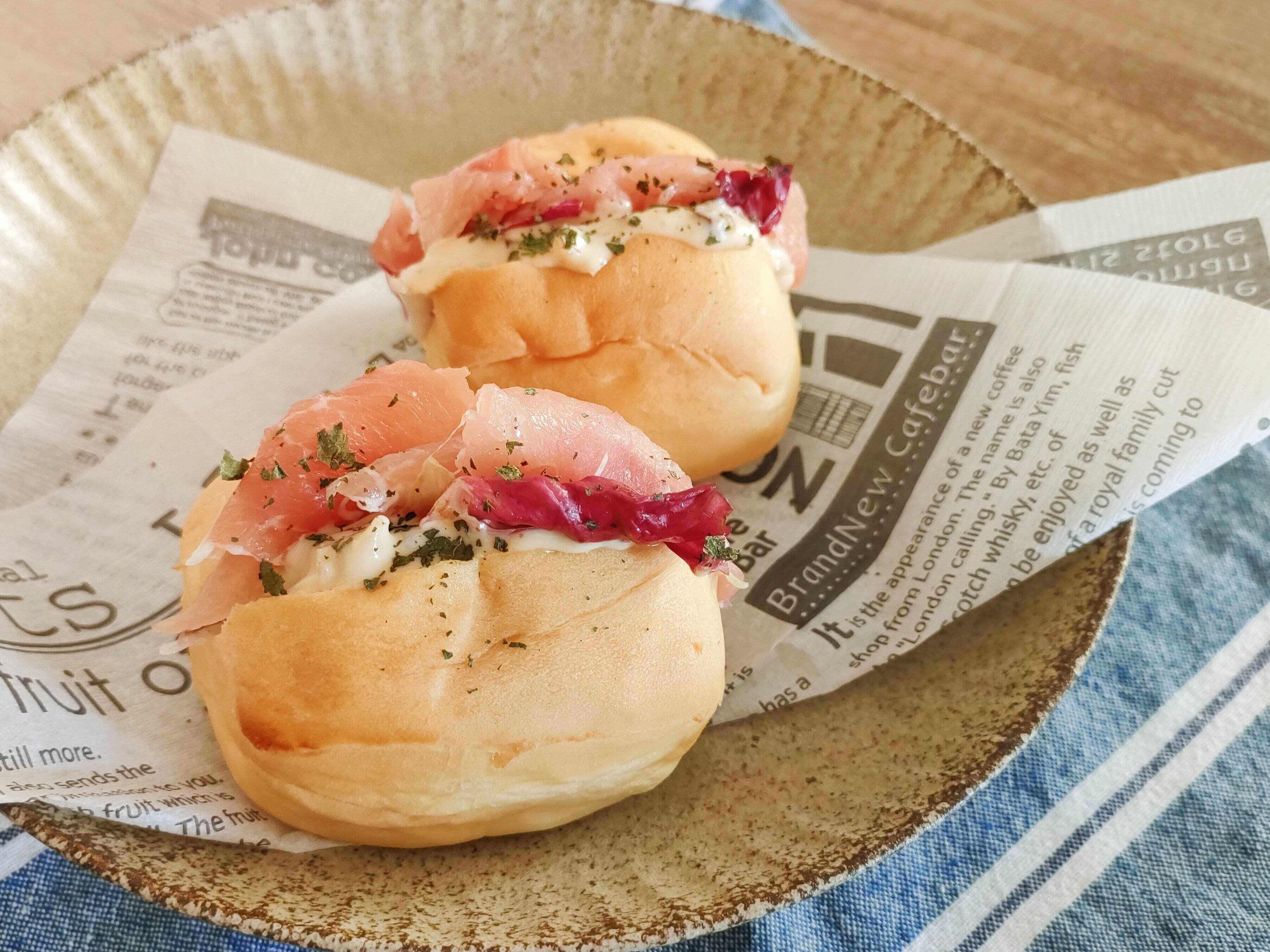 シンプルにお好きな野菜(レタスや紫玉ねぎなど)と生ハムを挟むだけの簡単惣菜パンレシピ。