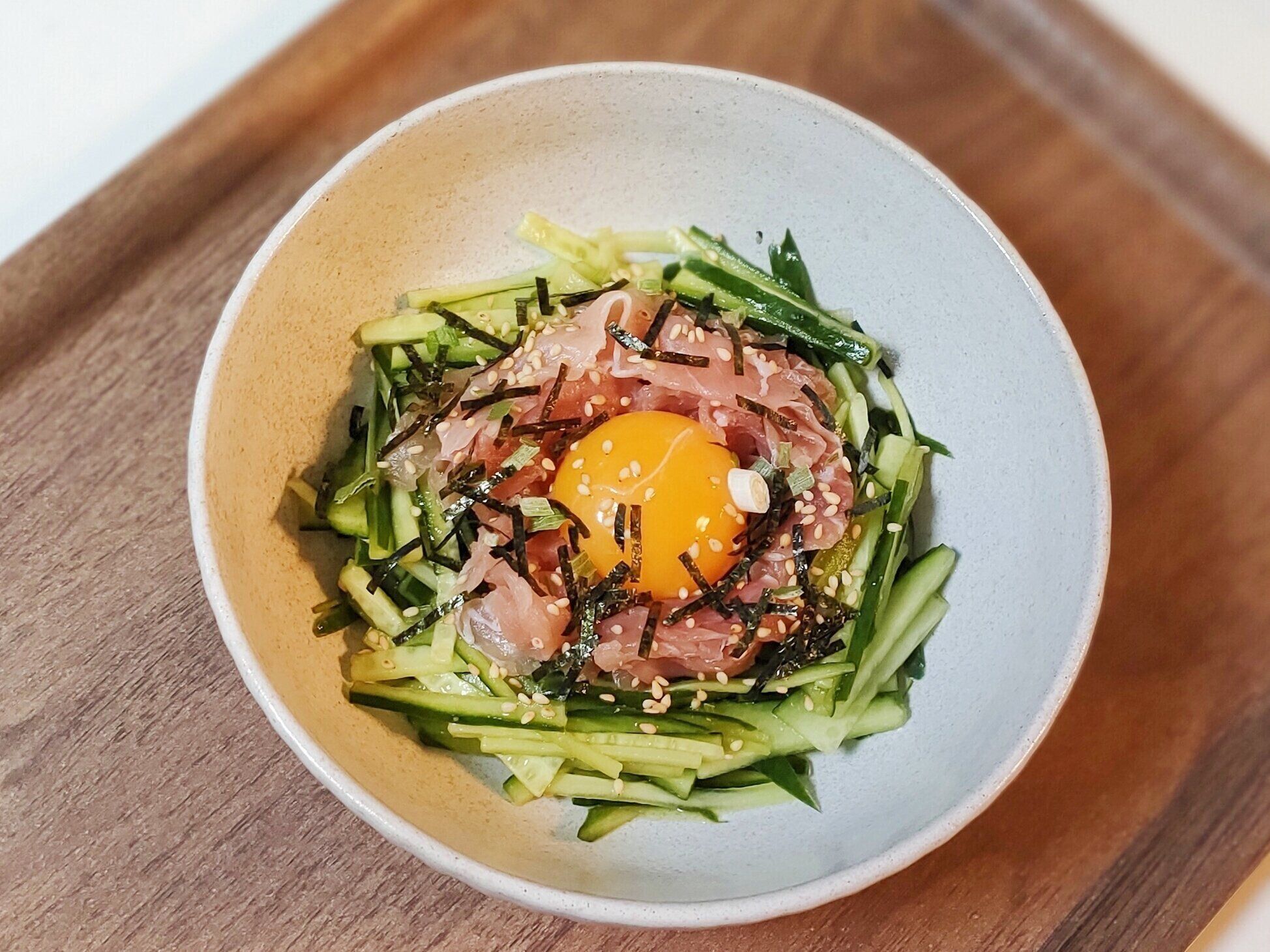 生ハム、キュウリを細切りに刻んでおきます。外側からキュウリ、生ハムの順に丸く盛り付け、仕上げに卵黄を真ん中にのせます。お好みで海苔やゴマを散らせば出来上がり!