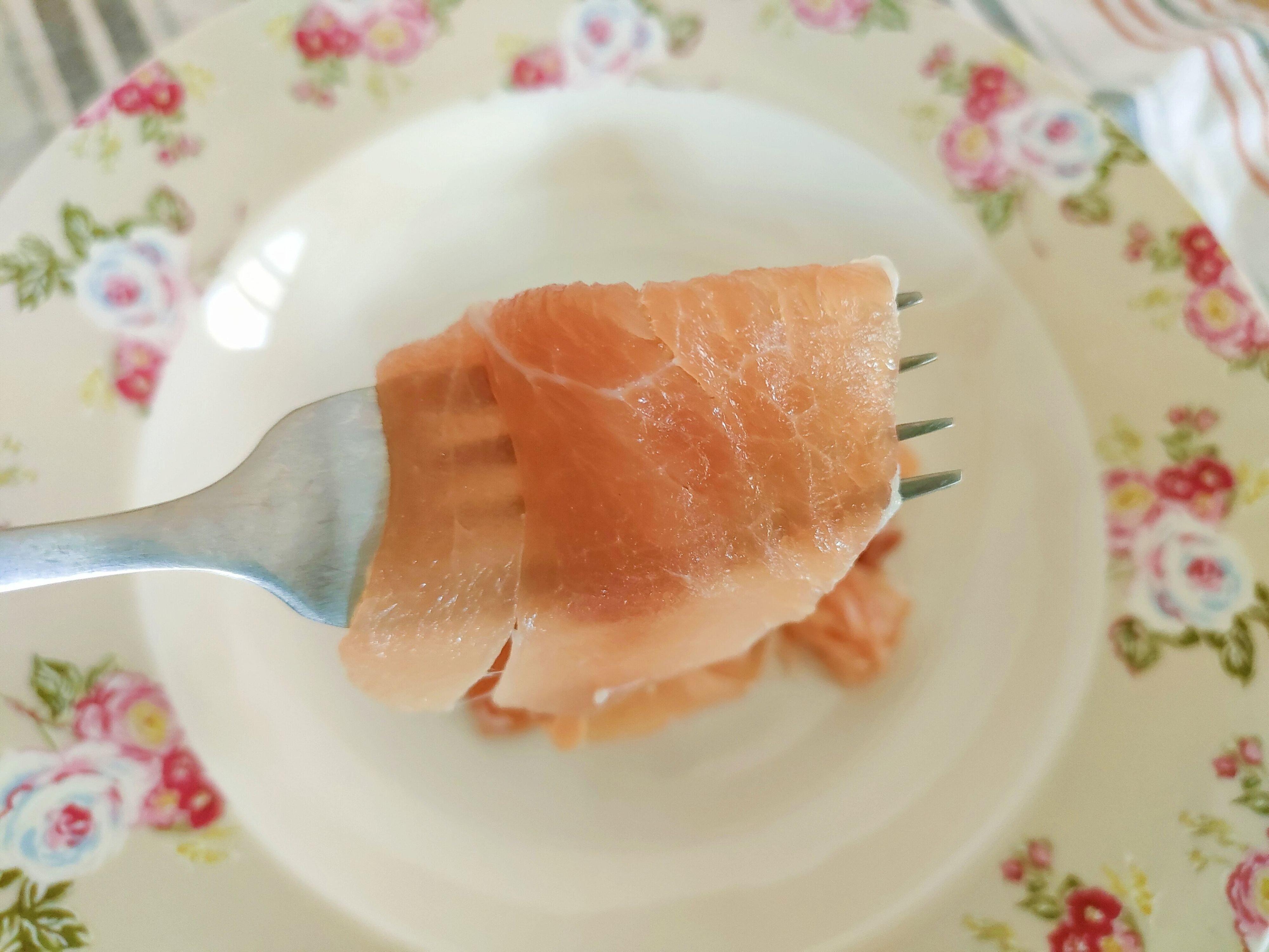 実際にパックから取り出すと、思わず喉がなってしまいそうな良い香りに包まれます。ちょうどいいスモークの香りがより一層食欲を掻き立ててくれそう!特にワインやシャンパンにはぴったり。ちょっと豪華なおうちごはんにもオススメ。