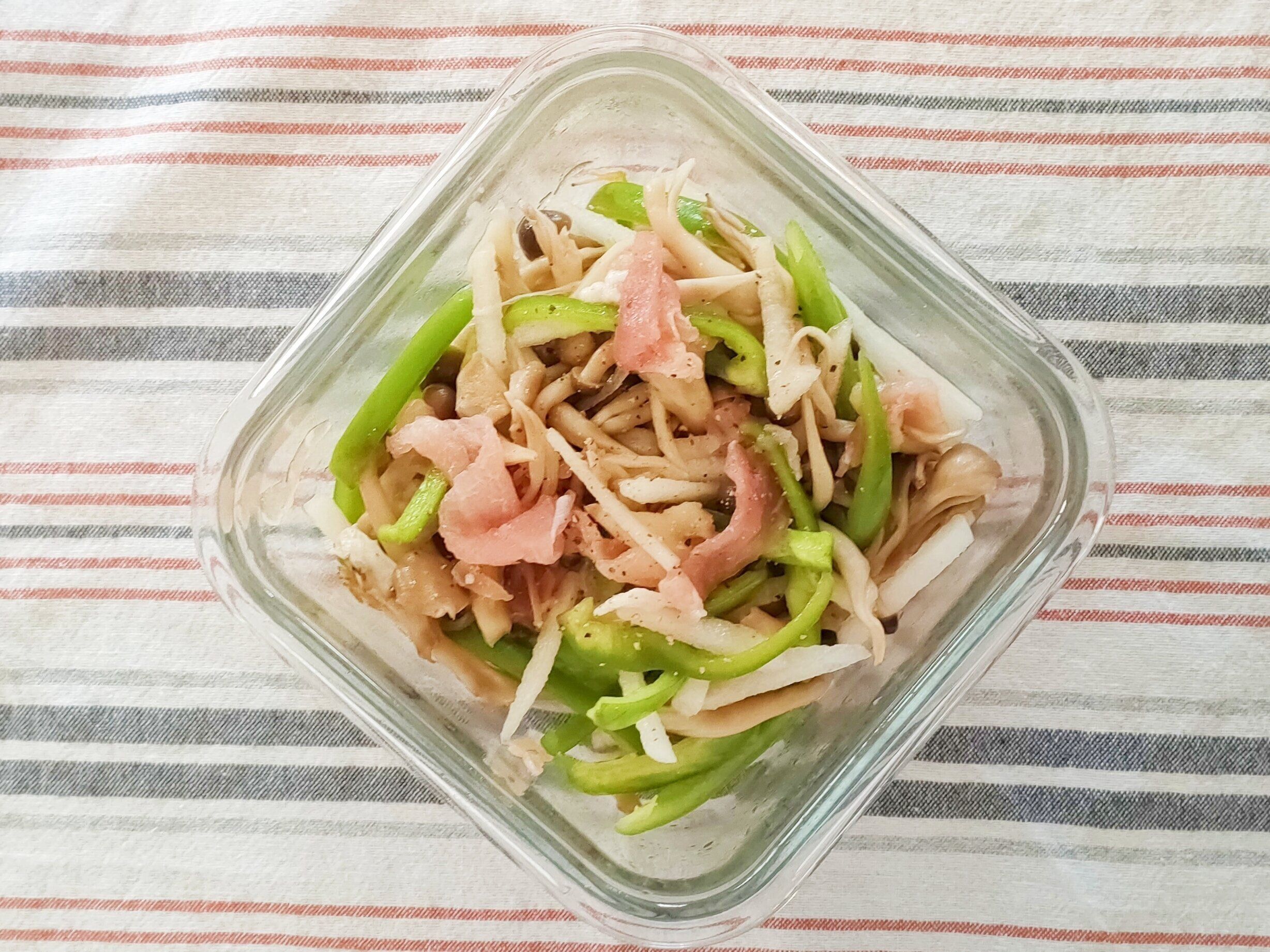 生ハム、パプリカ、なしを細切りにしておきます。しめじはチンしておきましょう(600Wで1分半ほど)