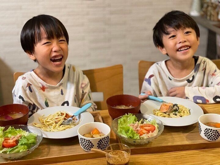 今回、リケンの「素材力だし」を使って調理してもらったのは、サンキュ!インスタグラマーのTomokeimamさん。6才の二卵性双生児の男の子のママで、子どもとおいしく食べられるように、毎日の食事作りに奮闘中。TomoくんもKeiくんもママが作る料理にいつも興味津々なんです。