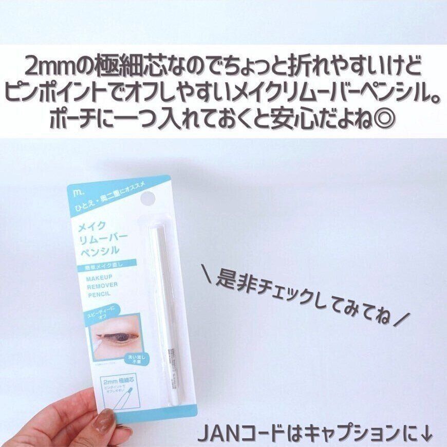 こちらは、ひとえや奥二重のかたにオススメなアイメイクに特化した「モイティフル」というダイソーの新しいコスメブランドから出た、「メイクリムーバーペンシル」(110円)。2mmの極細芯なので、アイライナー感覚でお直ししたい所をピンポイントに消すことができます。とてもお安いので、ポーチに1本入れておくといいかもしれませんね。