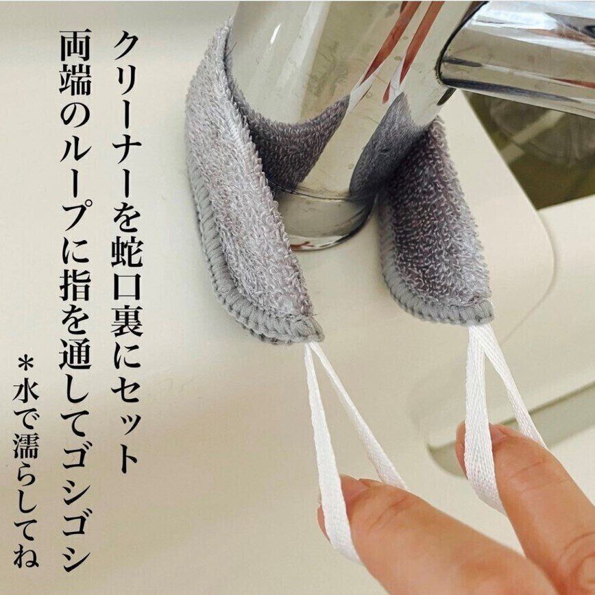 使い方はタオルを水で濡らして、両端にループがついているので蛇口裏に回し入れてゴシゴシするだけ。あっという間に水垢が落ちてキレイになります。短時間で手こずることなく掃除が出来るので要チェックです。