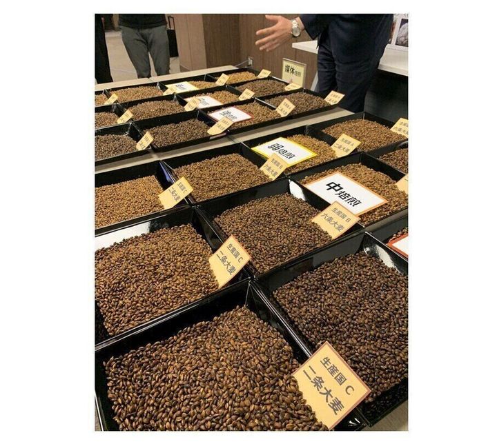 写真は、原料である六条大麦、二条大麦の一部。それぞれ焙煎方法の強弱を変えてから抽出したものを、幾度となくテイスティングを重ねてベストな割合を作り出していくのだそう。