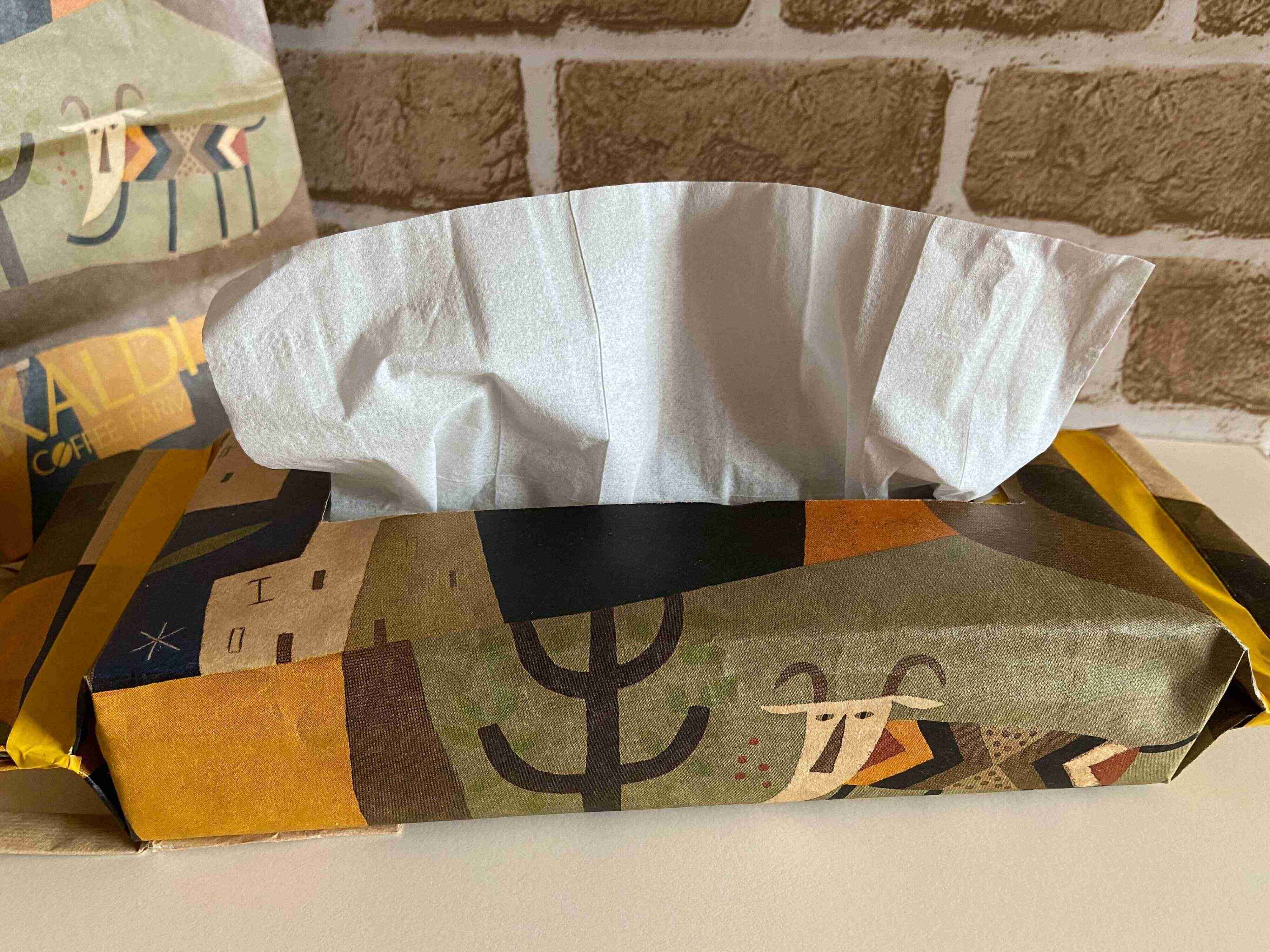 筆者は紙袋のリメイクは初めてでしたが、通常版デザインのカルディ紙袋のMサイズを使ってティッシュケース作りに挑戦してみました。