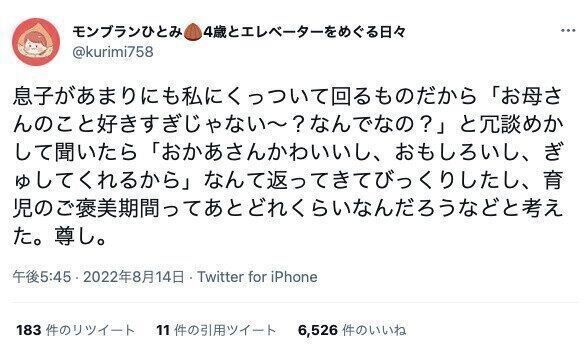 モンブランひとみ4歳とエレベーターをめぐる日々さん(@kurimi758)がTwitterで育児中の1シーンについてツイートしたところ、息子さんの尊くてかわいい言葉にたくさんの反響が寄せられました。モンブランひとみさんにお話を伺っています。