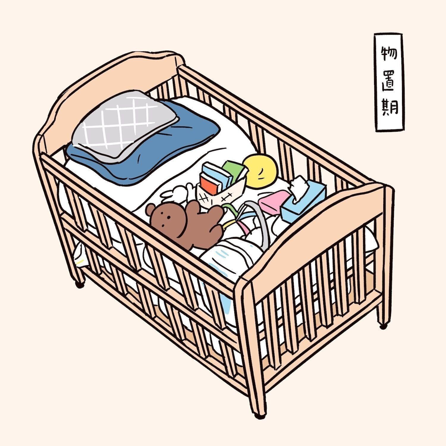 たろうさんは、赤ちゃんの誕生に合わせて準備をする人も多いベビーベッドを、4つの期間に分けて表現しました。