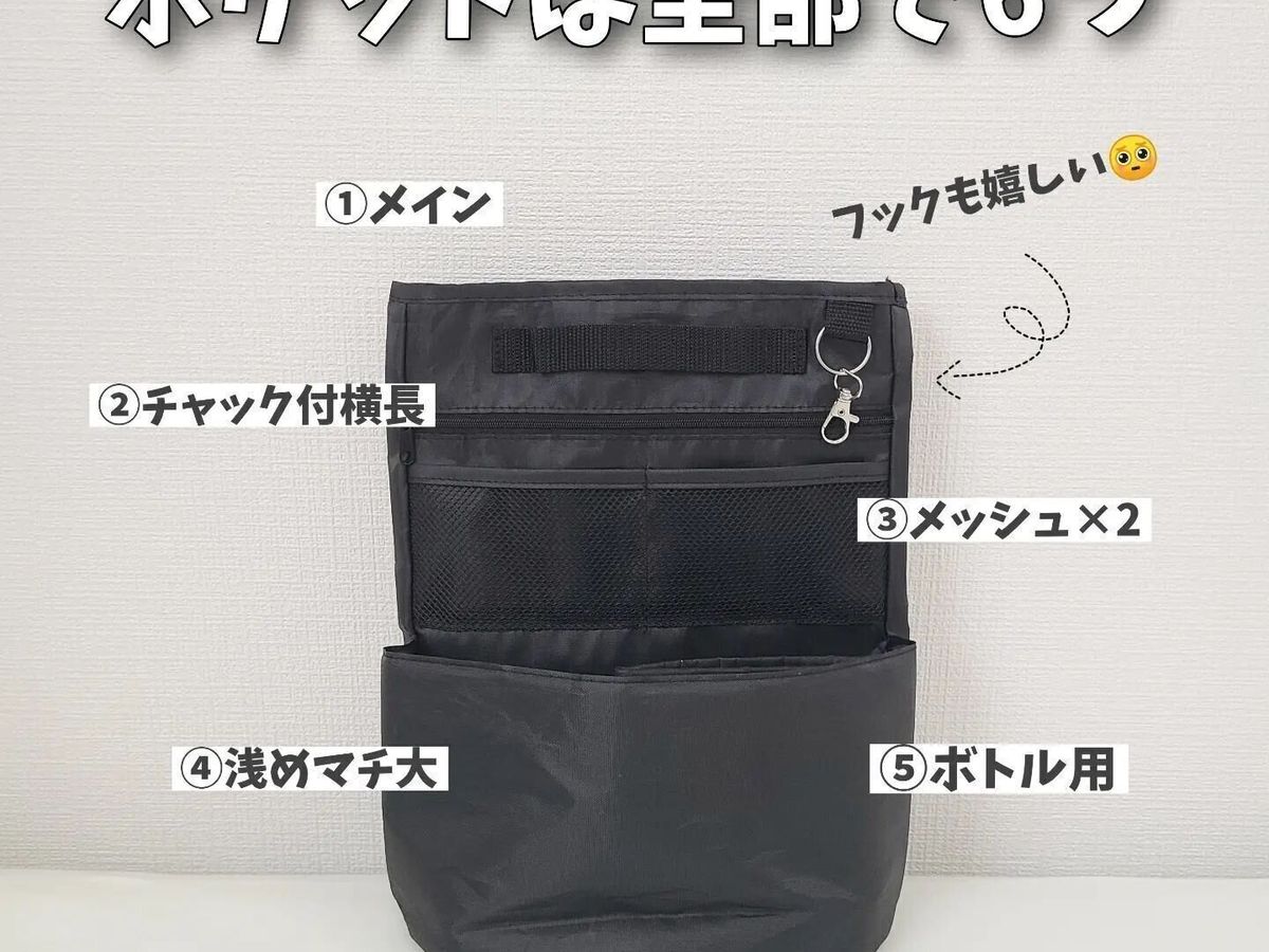 SNS上でも話題になっている、ダイソーの「バッグインバッグ(リュック用)」。これがひとつあれば、バッグの中が常にすっきりとします。6つのポケットは、こまかなアイテムを入れる用や大きなものを入れる用、水筒などのボトルを入れる用まで、さまざま。いつも持ち歩いているアイテムにぴったりの収納スペースが用意されています。メインのポケットは、A4サイズの書類なども入るサイズ感です。値段は、330円。バッグのなかをすっきりさせたいと考えている人におすすめのアイテムです。
