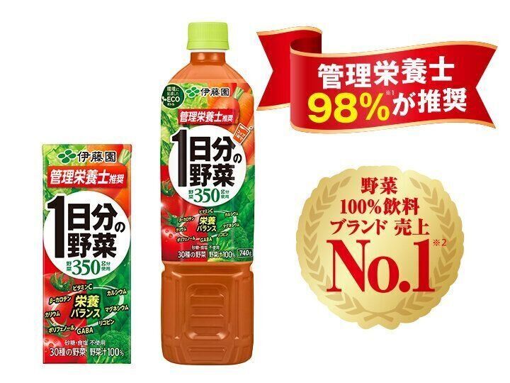 管理栄養士98%(※1)が推奨!野菜100%飲料ブランド売上No.1(※2)伊藤園「1日分の野菜」