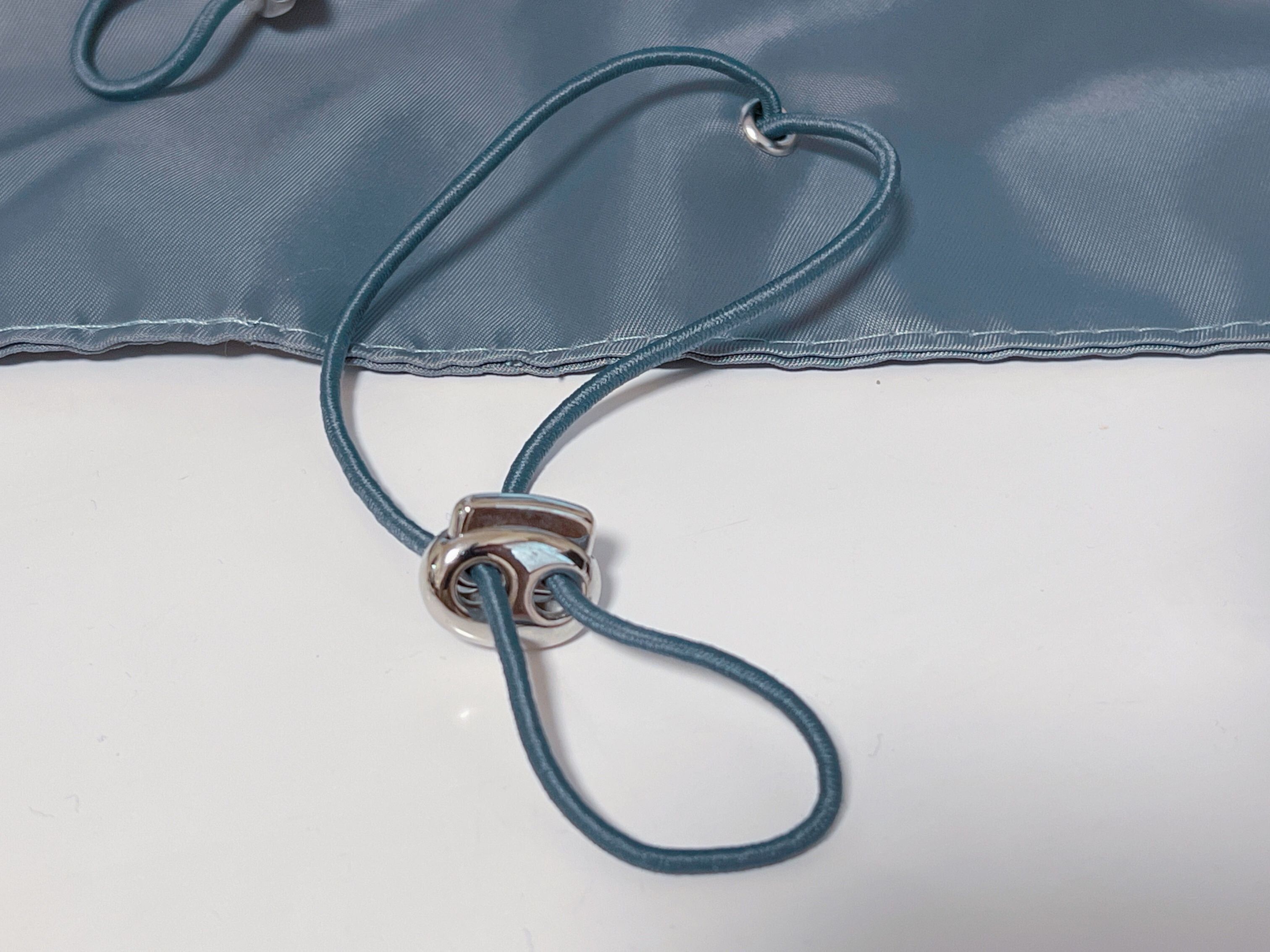 くるくると巻いた後はゴムで留めます。本体を巻いた時の膨れ具合によってゴムを調整できます。