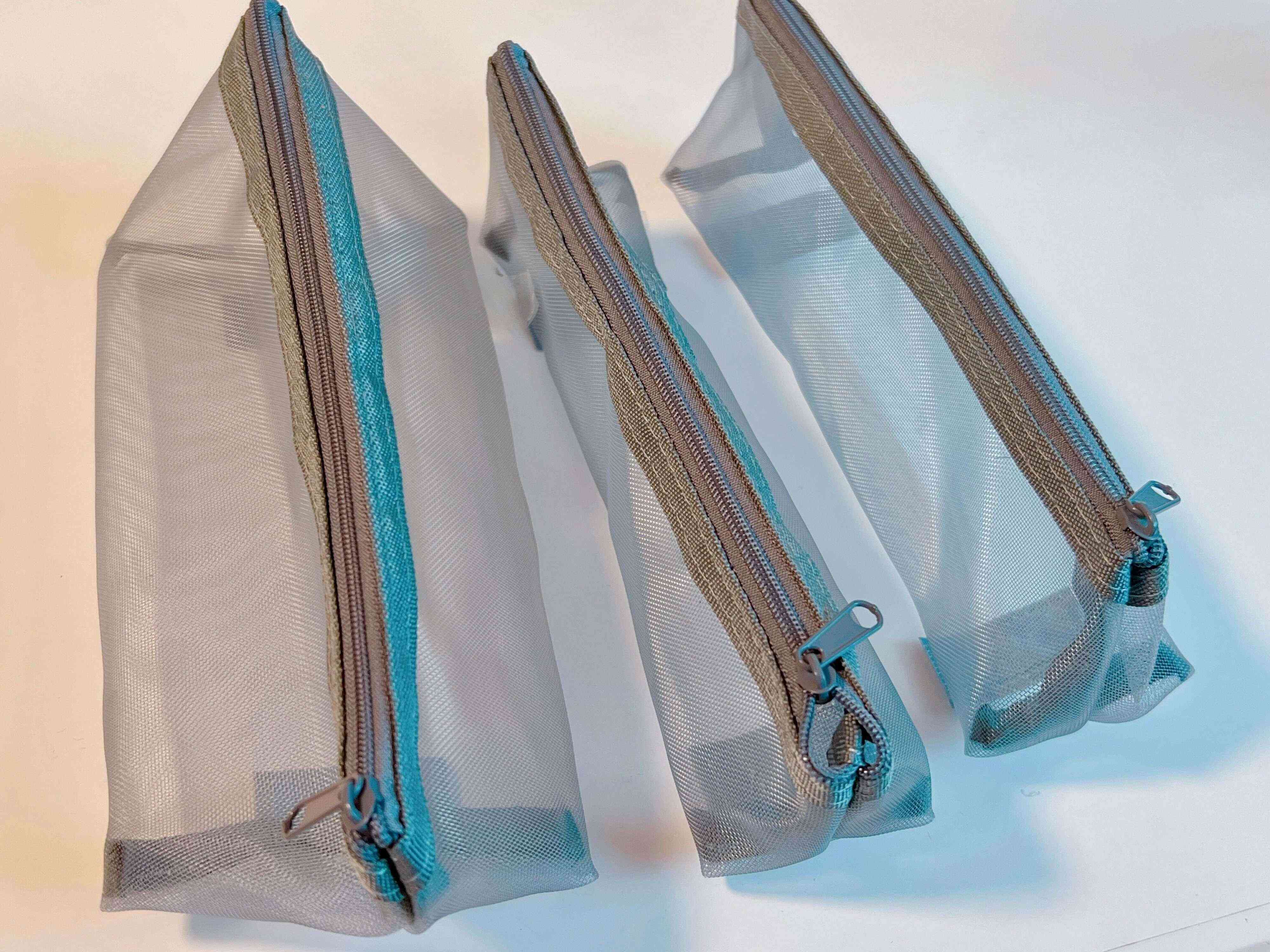3COINSの「取り外しメイクポーチ」は広げると、中に3つのメッシュポーチが並んでいます。メッシュポーチのサイズはS、M、Lとそれぞれサイズが異なっているのがポイント。