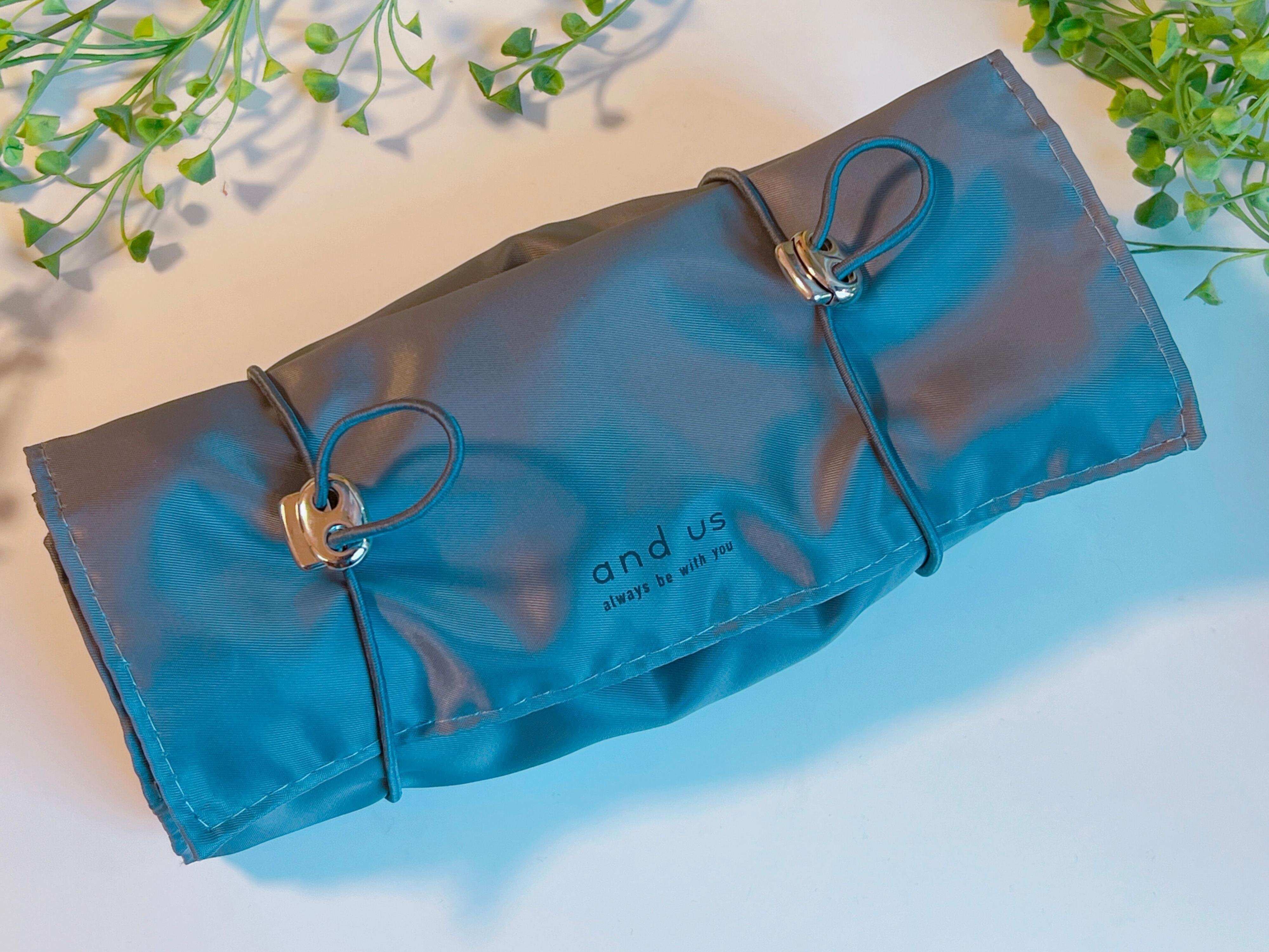 3COINSの「取り外しメイクポーチ」(550円)は中に取り外しができるメッシュポーチが3つ付いた便利なメイクポーチです。大容量で、クルクルと丸めてゴムで止めるだけ!