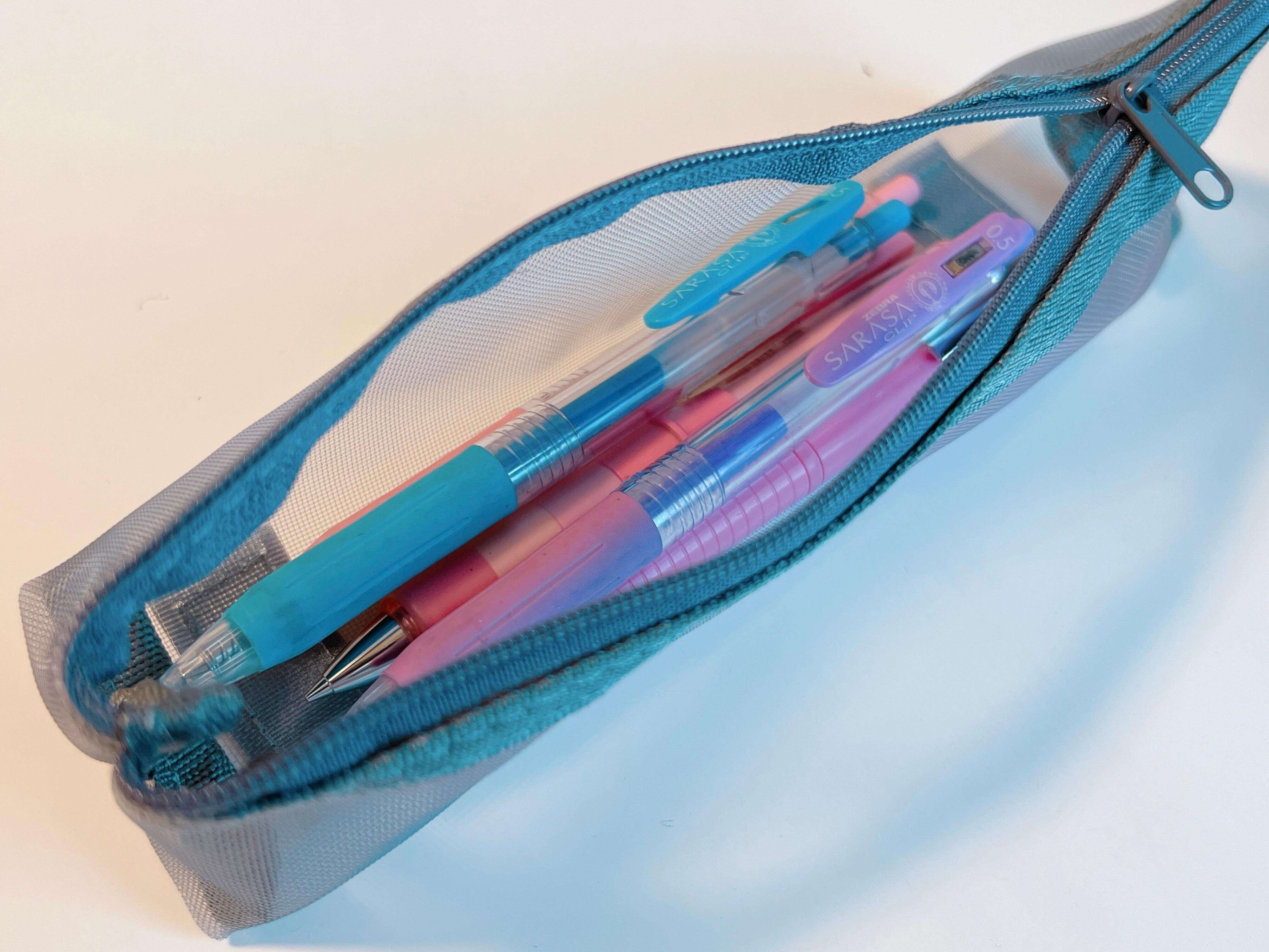 小さいサイズのメッシュポーチを取り外して、ペンケースとして使っても便利です。