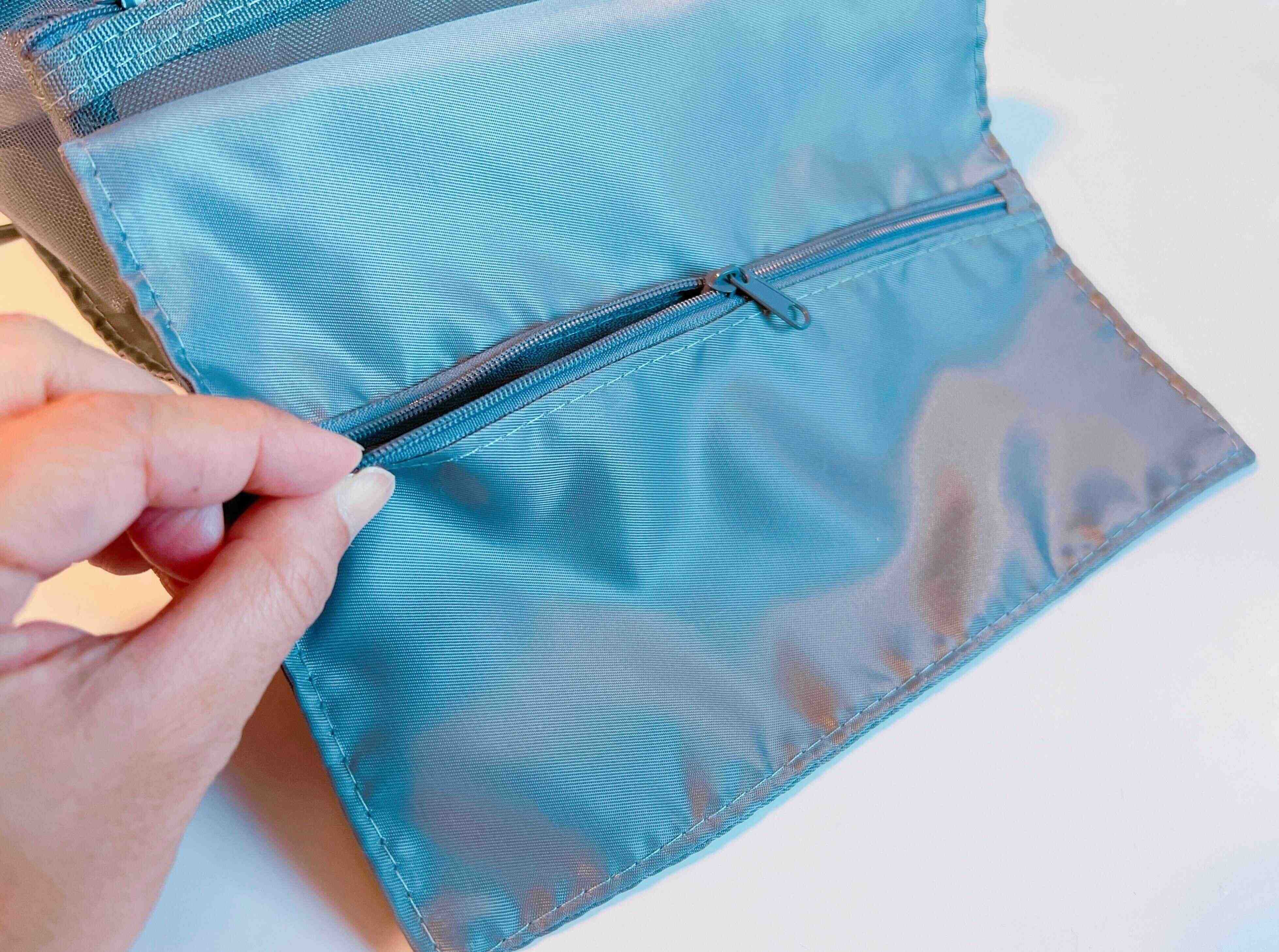 逆に外からは見えない方がいい物はこちらのチャック付きのポケットへ。マチが無いので、ヘアアクセサリーや薬などの小物向けです。外側の生地は汚れに強い撥水生地になっています。