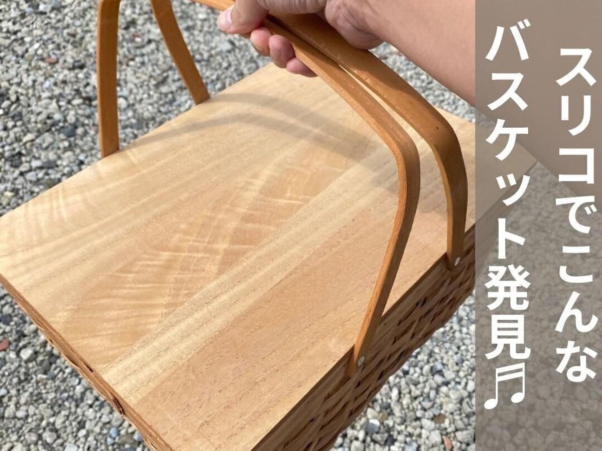 「ウッドチップフタ付きバスケットL」はスリコではお高めの2,200円商品。でも、その使い勝手のよさとすぐれたデザインで注目度バツグンのアイテムなんです。しっかりとしたつくりなので、アウトドアで大活躍し、フタをすればテーブルにもなります。「おしゃれピクニック」の小道具にぴったりのかわいさです。もちろんお部屋で収納かごとして使っても便利ですね。