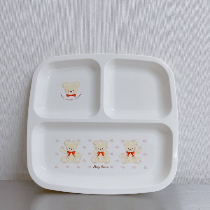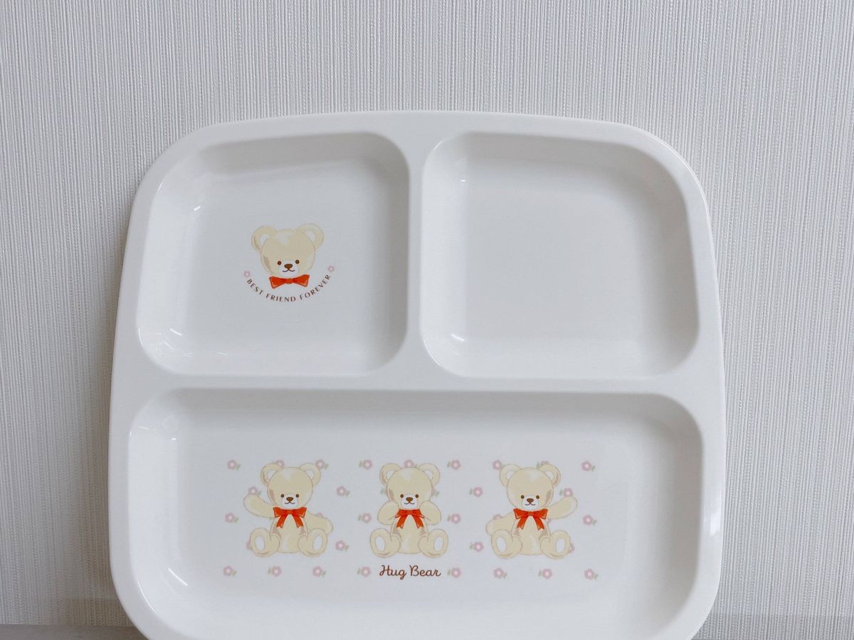 「お子さまランチ」をイメージさせる3つの部屋に分かれた白ベースのお皿に、テディベアのかわいい絵柄がプリントされています。
