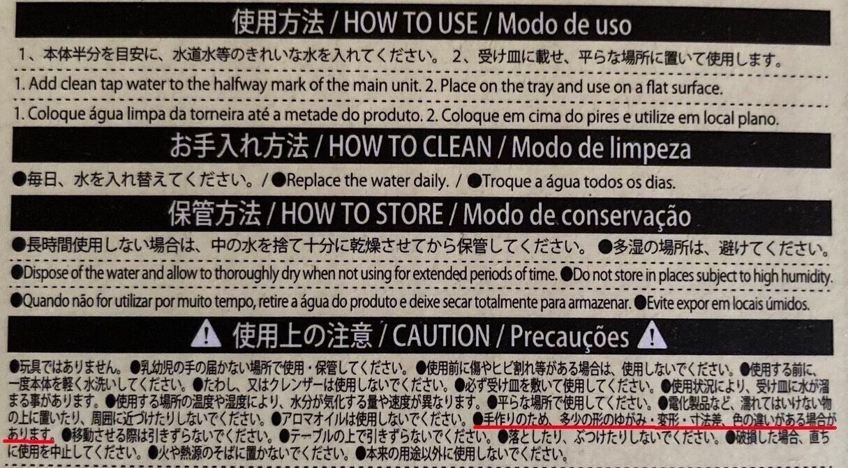 「手作りのため、多少の形のゆがみ・変形・寸法差、色の違いがある場合があります。」