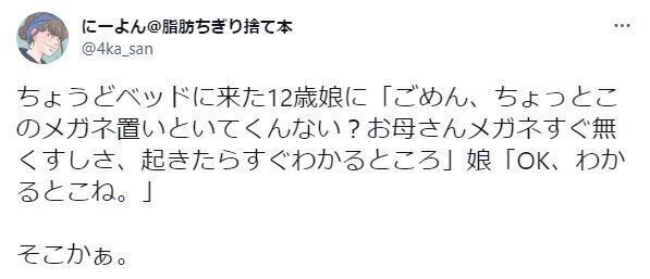5人のお子さんを育てるにーよん@脂肪ちぎり捨て本さん(@4ka_san)が、12歳の娘さんとのやりとりを投稿したTwitterに3,600件以上もの「いいね」が集まりました。メガネを無くさない場所として選んだところとは?話をうかがいました。