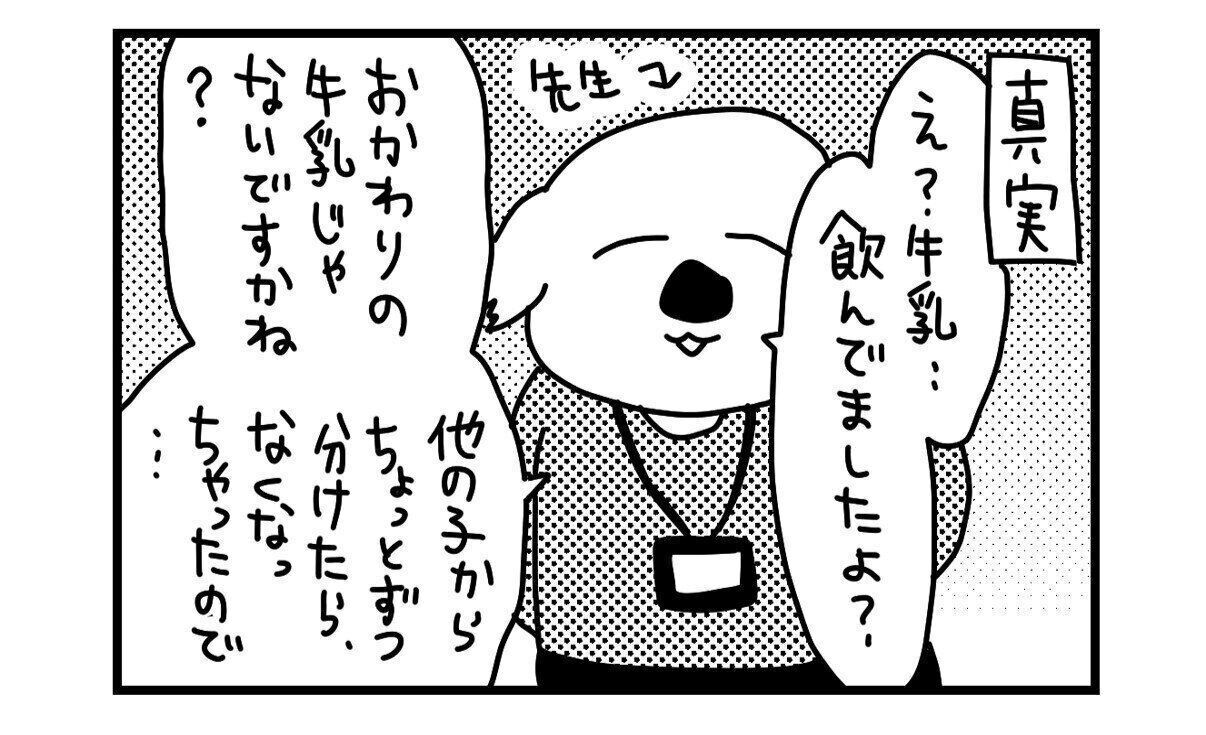 まさかの真実が待っていました。先生が言うには「牛乳は飲んでいた」「おかわりの牛乳ではないか」とのこと。無事に自分のぶんの牛乳は飲めていてよかったですね!