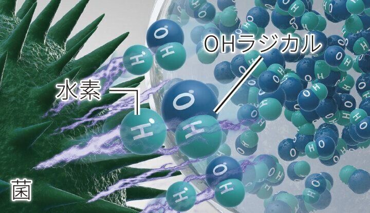 A.「ナノイー」は水で包まれたナノサイズの清潔イオン。ナノイーに含まれる「OHラジカル」という成分が、空気中の有害物質から水素を抜き取り変性させることで、その働きを抑制(※1)します。OHラジカルの量が多いほど効果が期待できるのですが、ナノイーにはそのOHラジカルがたくさん含まれています。