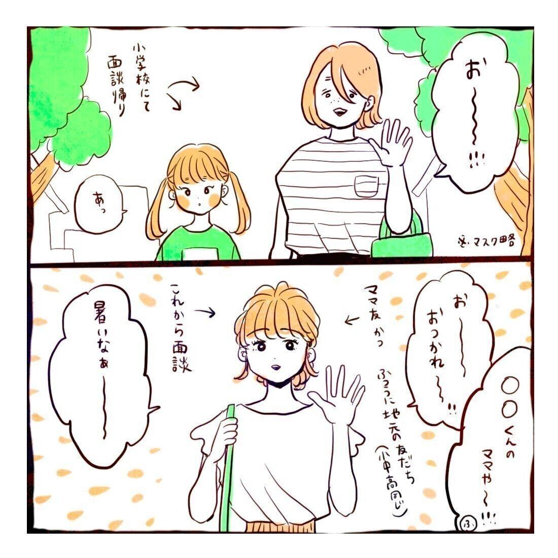 小学校で面談を終えた、うめさんと6歳の長女ふーちゃんは、帰り道でママ友にばったり会います。