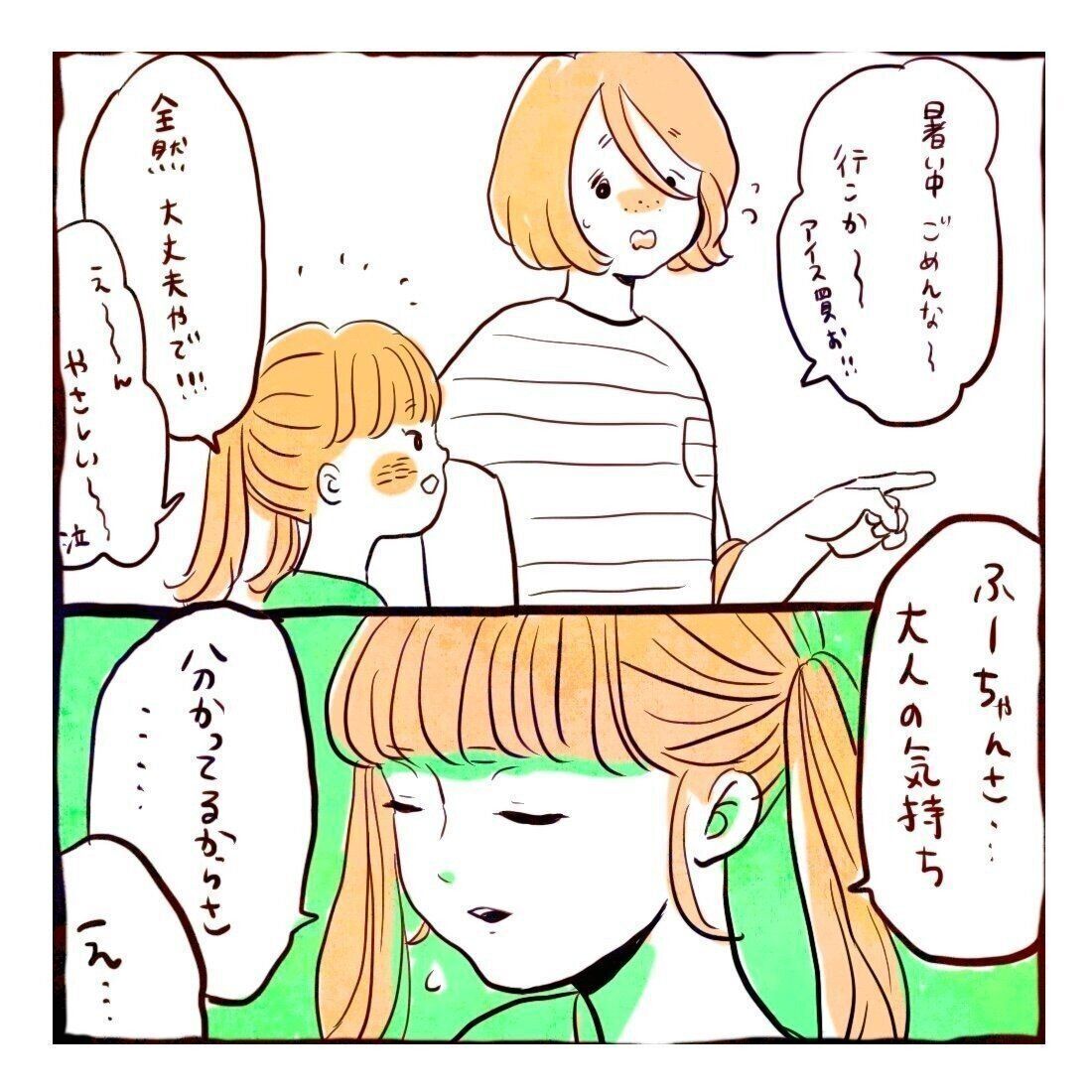 これから面談に向かうママ友と別れ、暑いなか待たせたおわびをするうめさんに、ふーちゃんは大丈夫だと答えるのです。