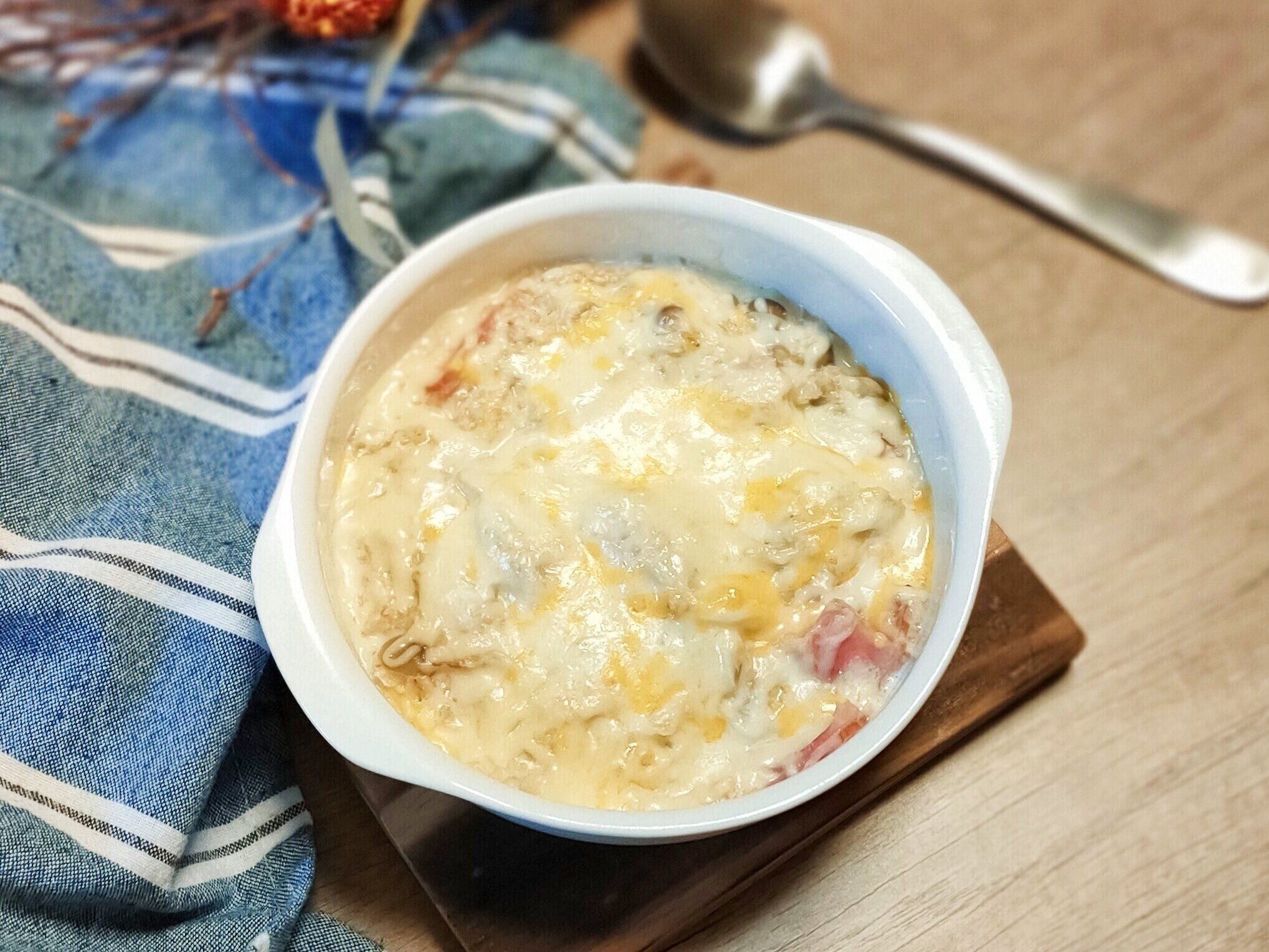 3.よく混ぜ合わせて溶けるチーズをのせる