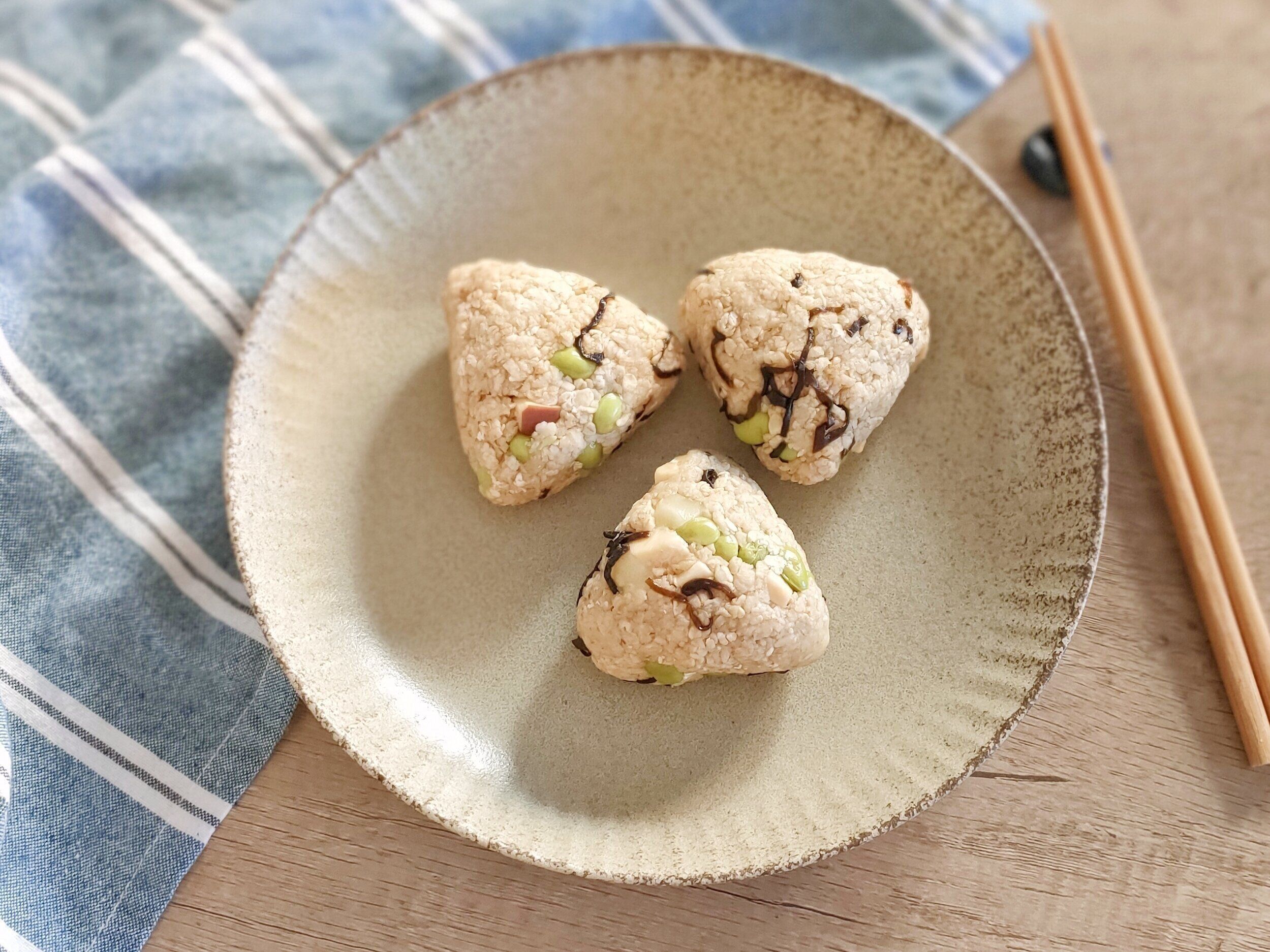 もちもちしたオートミールに、塩気のあるチーズと塩こんぶがアクセントになって、お弁当にもぴったりなおにぎりの完成です。枝豆の彩りが鮮やかできれい!