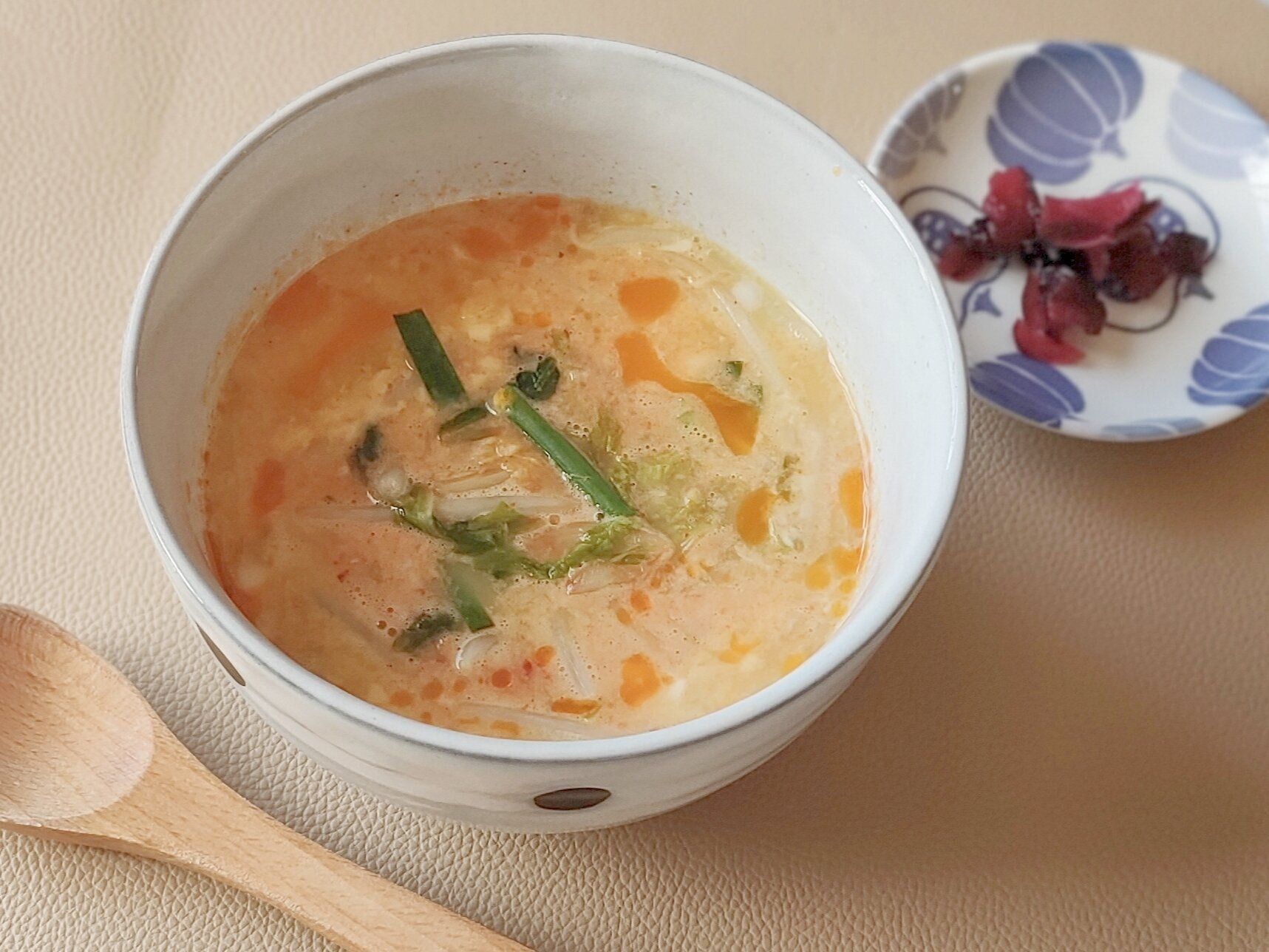 レンジの加熱時間は野菜の量で調節しながらやってみてください。プチプチの食感が楽しいクッパ風スープで身体がポカポカに温まりますよ。発酵食品のキムチと食物繊維豊富なオートミールの組み合わせは腸活にも最適です。