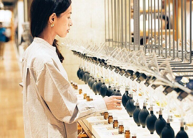 専用のテイスターに顔を近づけて、シュッとひと吹き。まるで調香師になった気分で好みの香りのエッセンシャルオイルを選んじゃおう。