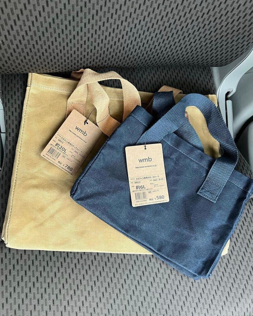 ワークマンの人気商品、パラフィン帆布トート。パラフィン加工が施してあるため水に強く、濡れてもさっと拭くだけでいいという優れものです。サイズもスモール、ミディアム、ラージの3種類あり、用途によって使い分けられます。アウトドアだけではなく普段使いもできるシンプルなデザインがいいですね。価格はスモールが580円、ミディアムが780円、ラージが1,280円です。