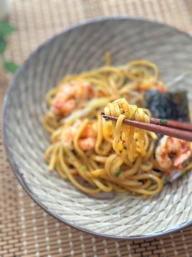 実際には、ラーメン店で出てきそうな王道の醤油ベースの味付けで、ニンニクとエビがアクセントになっている一品です。