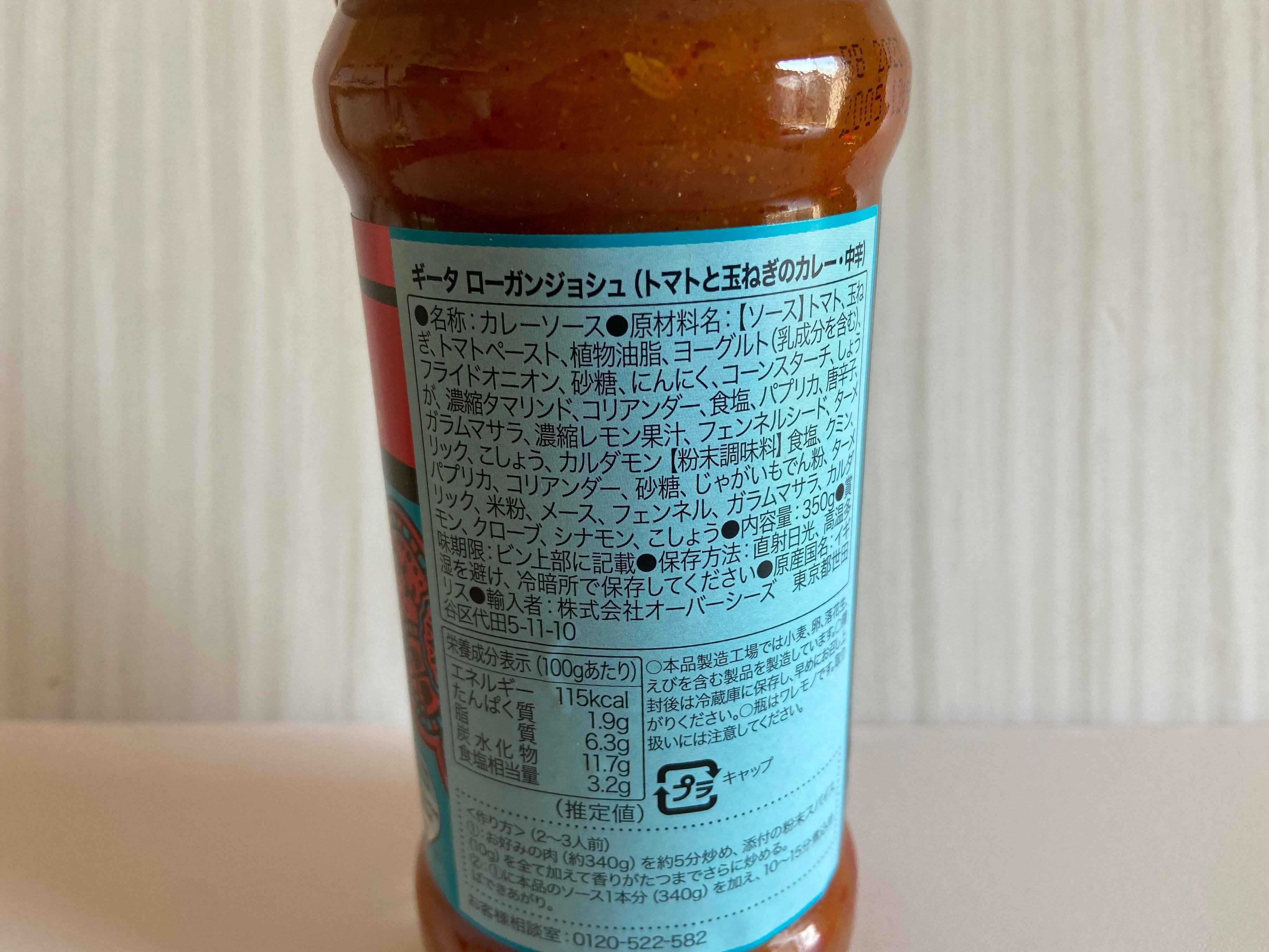 こちらは「ギータ ローガンジョシュ」(トマトと玉ねぎのカレー・中辛)という名前の商品です。珍しい瓶入りタイプのカレーペーストで、スパイスもセットになっているのが特徴。