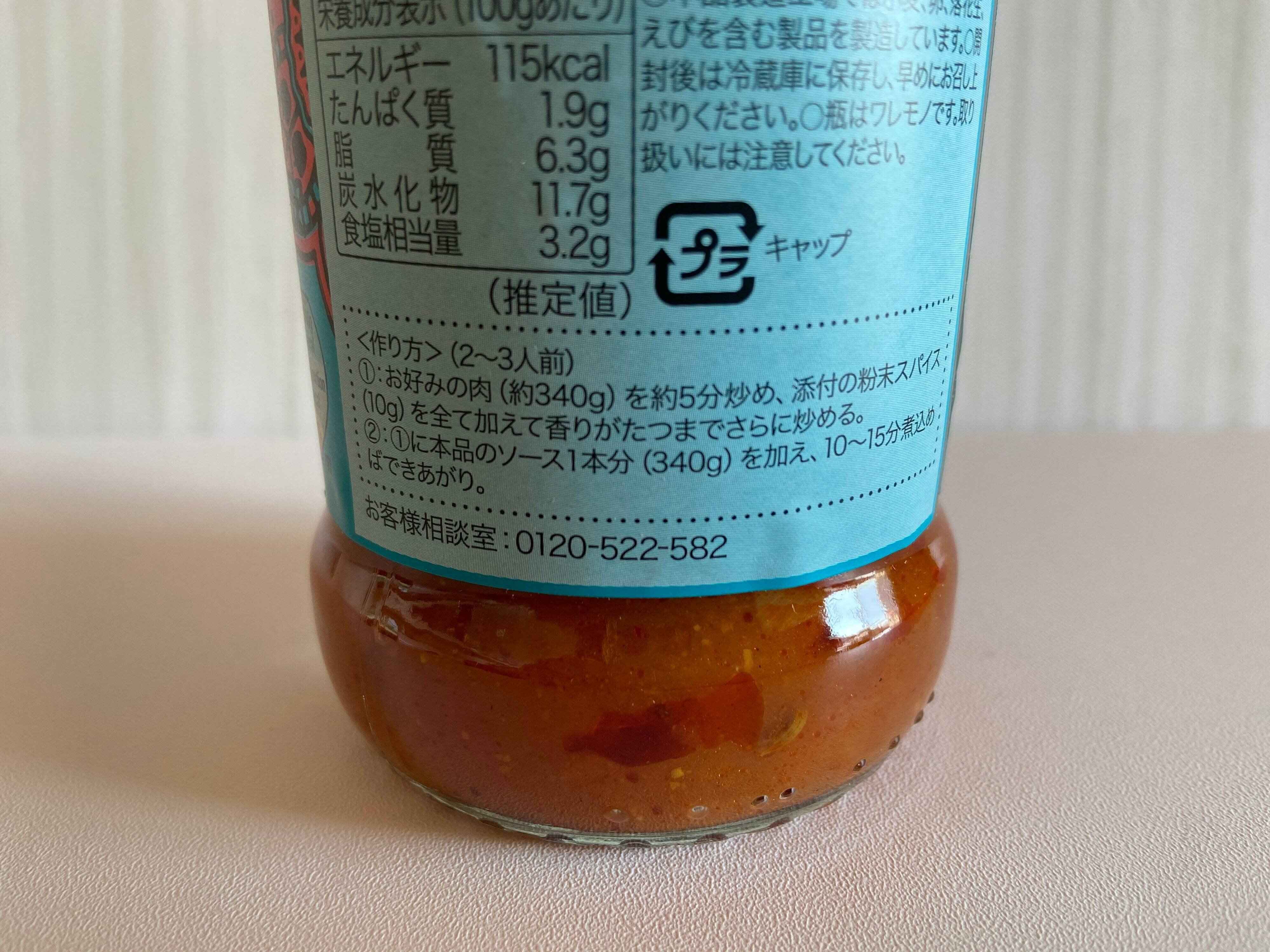原材料はトマト、玉ねぎにトマトペースト、ヨーグルト、フライドオニオン、にんにくに数種類のスパイス入り。カロリーは100gあたり115kcal。価格は598円です。