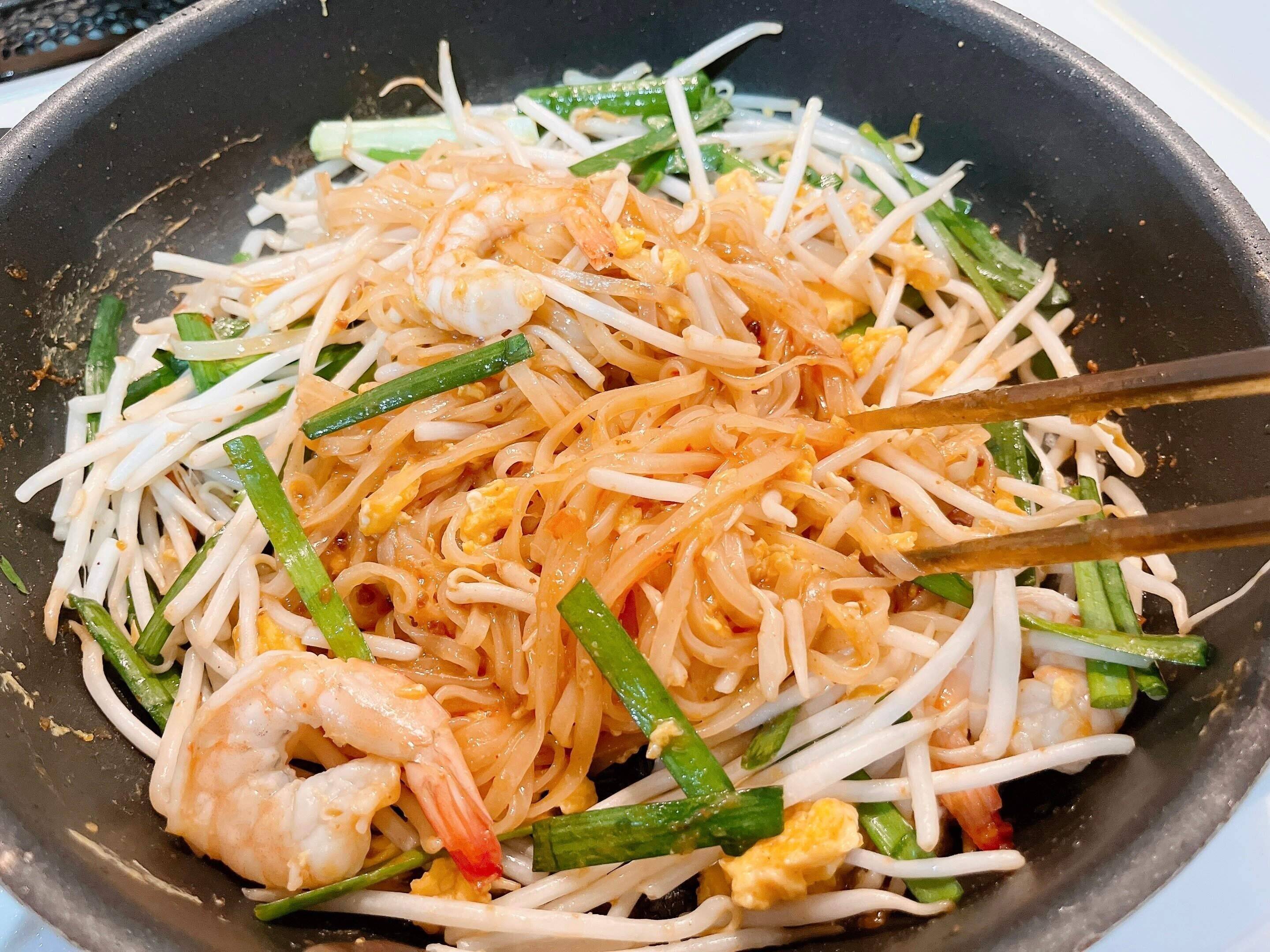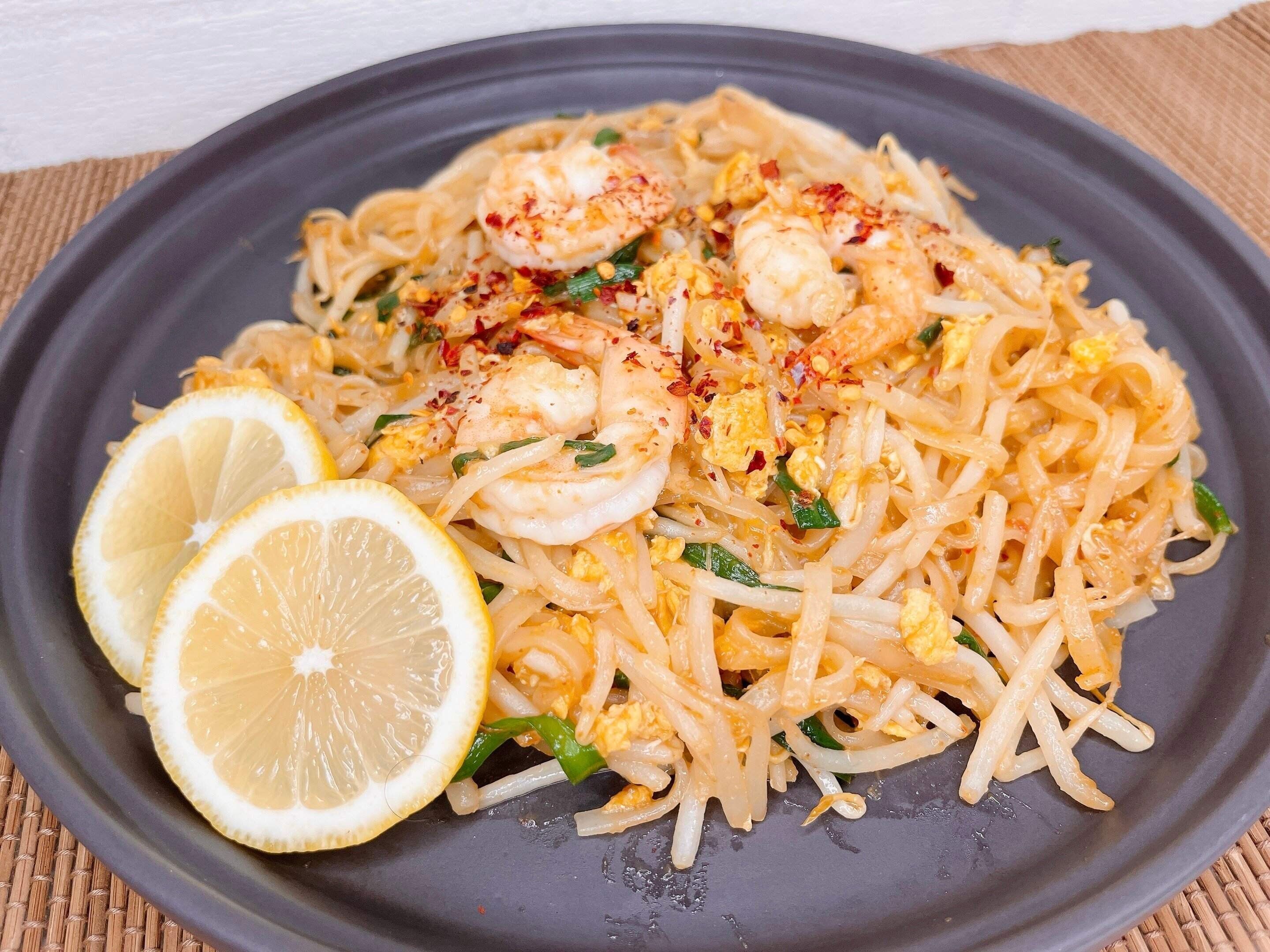 パッタイとは、タイで親しまれている麺料理。米粉でできた平たい麺を炒めて作るタイ風の焼きそばで、屋台では定番のメニュー。具材には、もやし・にら・エビなどを入れ、ナンプラーなどで甘酸っぱく味付けがされています。