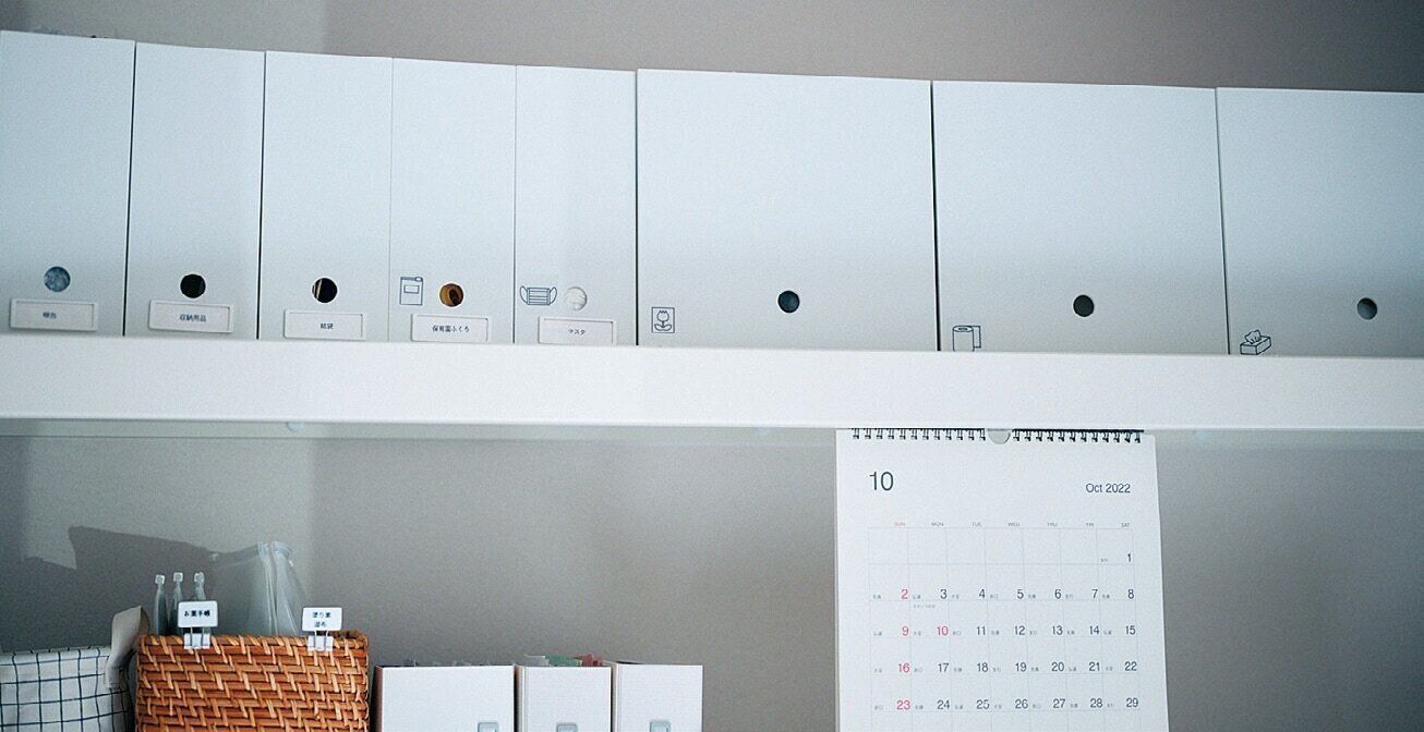 ペーパー類やマスクなどの日用品ストックをクローゼットの最上段に。入れている物がバラバラでも、高さ・奥行きがそろっているからすっきりまとまります。「外からでも中身がすぐ分かるようにラベリングを」。