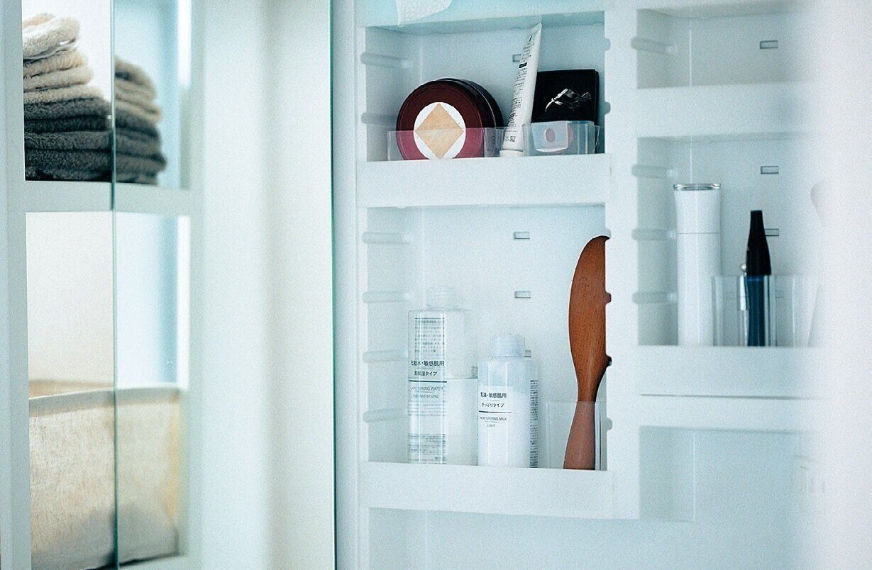 書類、文房具用として使われるファイルボックスを洗面所下の収納に活用。「あえて浅めのボックスに入れれば、在庫チェックもラク。同じ物をダブり買いしたりする失敗がなくなります」。