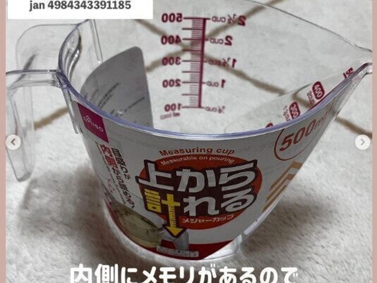 計量カップで調味料などを測る時に、いちいちかがんで測るのって、面倒ですよね。こちらの「上から測れるメジャーカップ」(110円)は、内側にメモリがついている優れもの。いちいちかがまなくても、上から量を測ることができるんです!