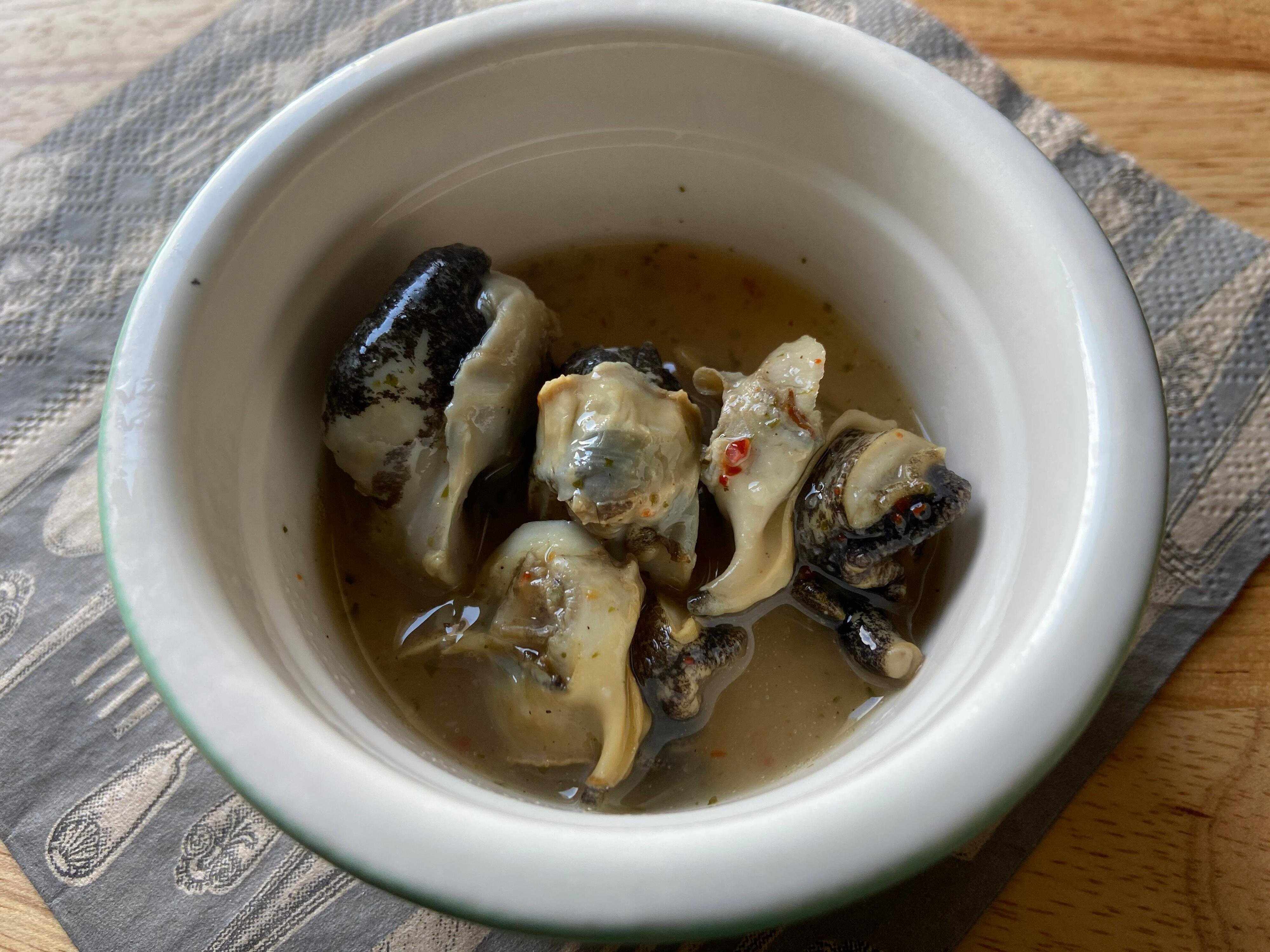開封してみるとごろっとつぶ貝が5個入っていました。むっちりとして食べ応えのあるつぶ貝、にんにくが効いたオイルもとってもおいしいです。