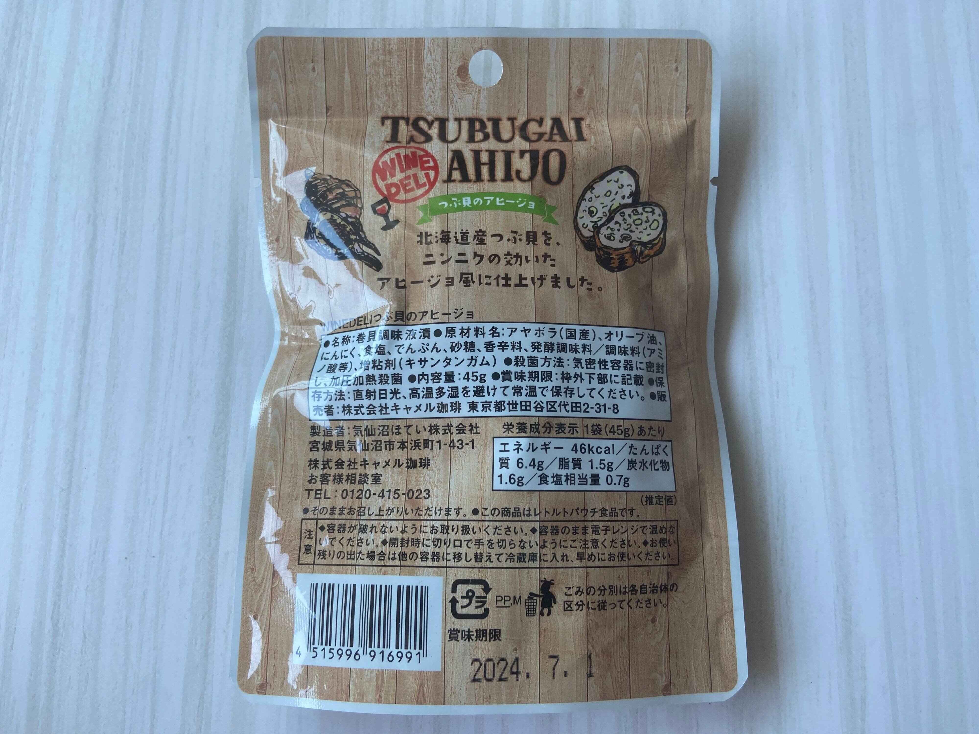 今回はおしゃれな「つぶ貝のアヒージョ」(購入時:248円)が気になり、購入してきました。