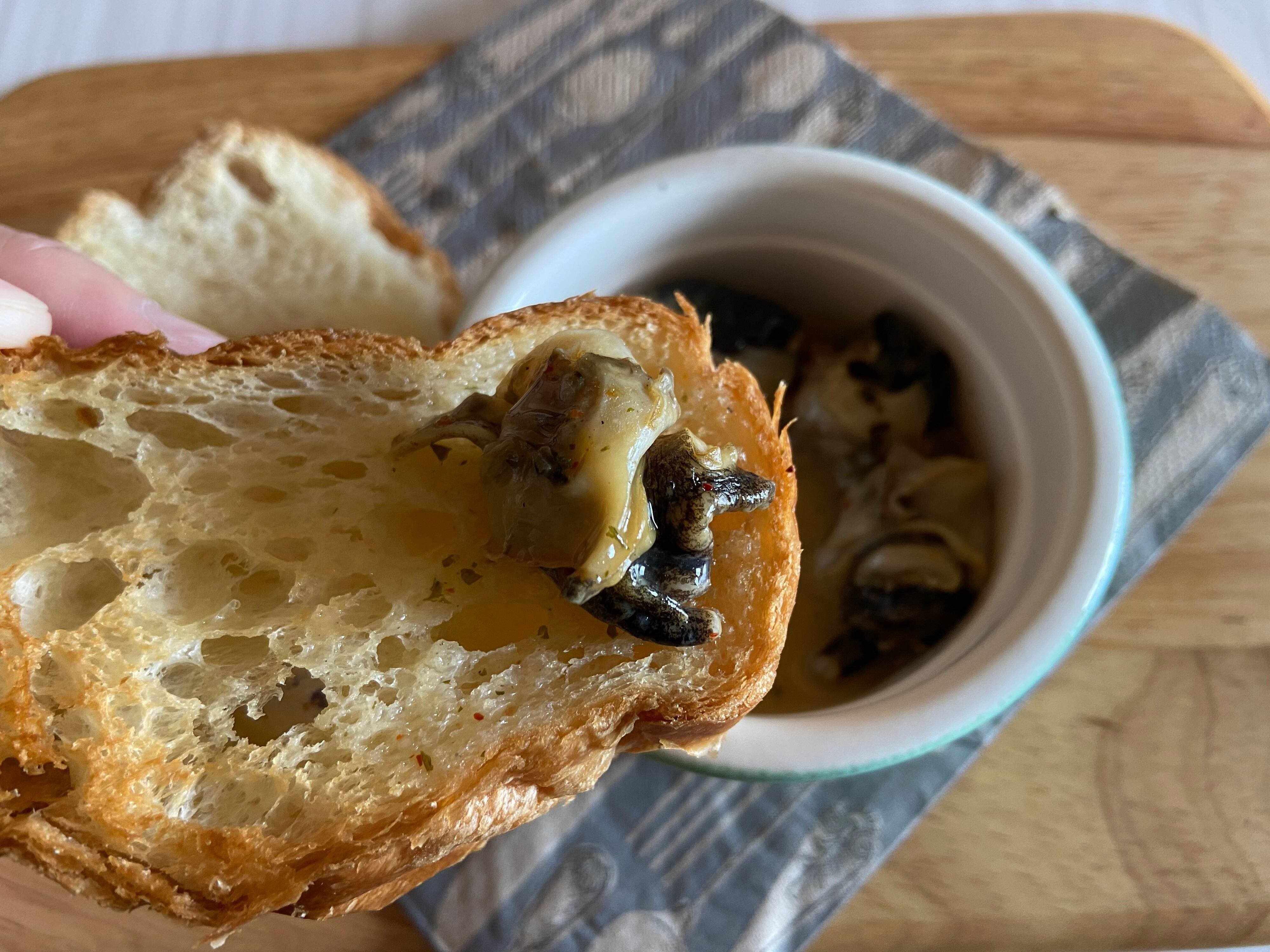 ついついお酒が進んでしまうおいしさ!アヒージョはオイルもおいしい料理なのでバゲットに浸して残さず食べるのがおすすめです。