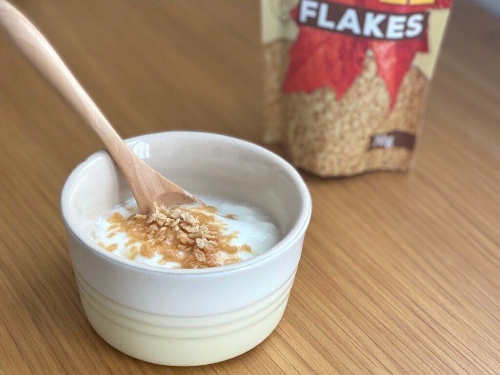 朝食の定番であるプレーンヨーグルトは、そのまま食べたり、ハチミツやシリアルと合わせる方も多いと思いますが、メープルフレークスもオススメ。