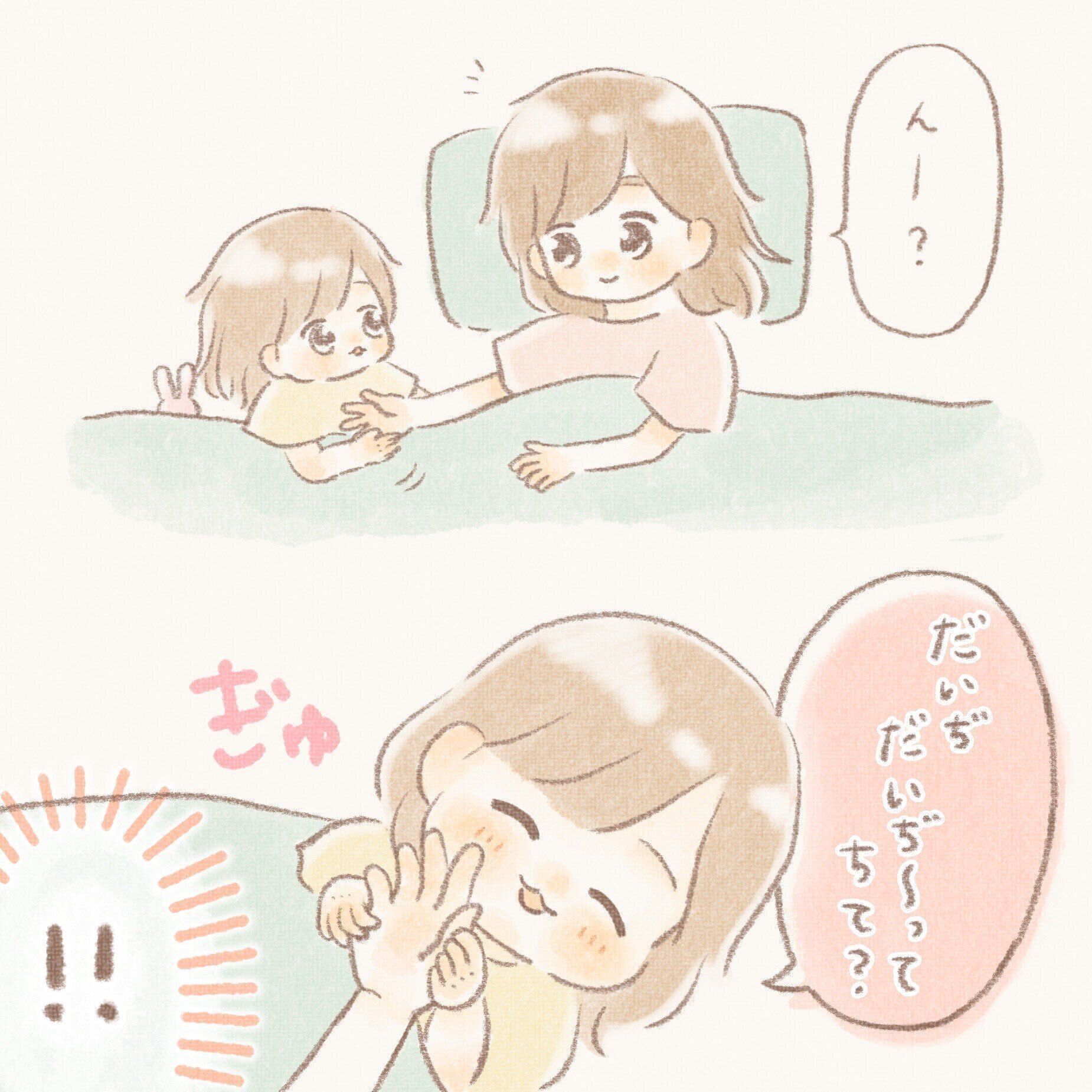 「もっとだいぢに〜!」というおねだりも含めて、かわいすぎます……!寝かしつけのときにたっぷりスキンシップをしてそのまま夜眠るというのも、幸せたっぷりで素敵な過ごし方ですね。