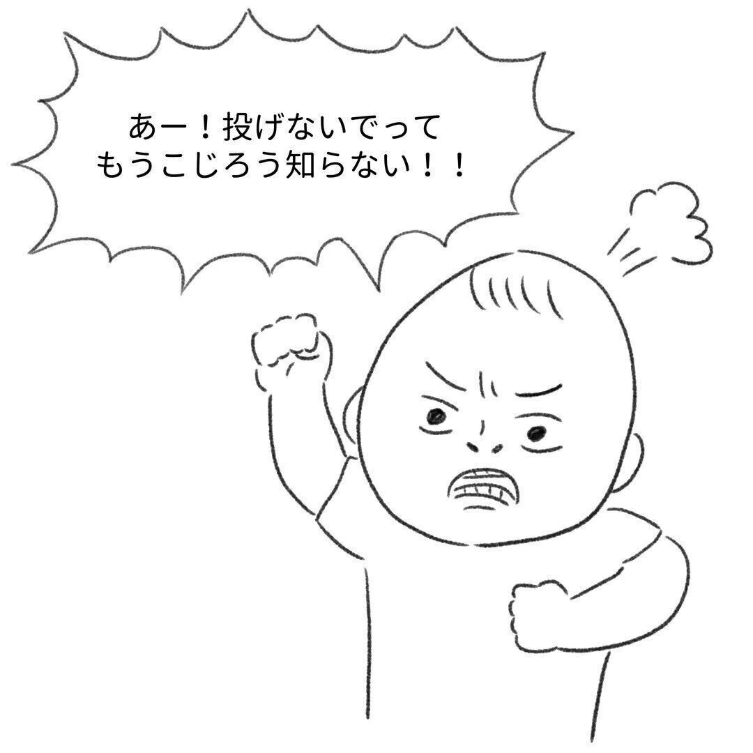 パパはそれを見て「投げないで!」と注意。「こじろう知らない!」と言ってその場を離れます。余裕がなく、頭にきてしまう瞬間もありますよね……。