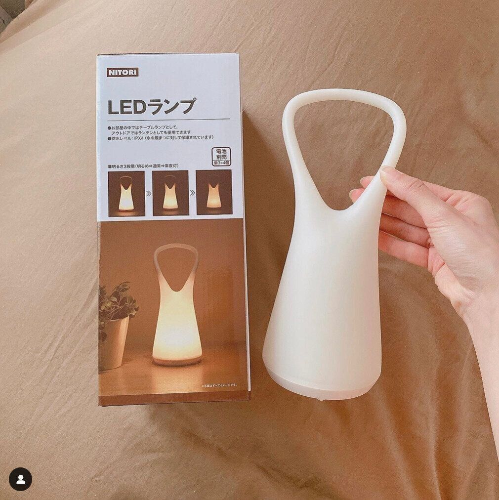 インスタで人気、3段階に明るさ調整が可能なこちらのLEDランプ、2,490円。乾電池式でコードレスのため、持ち運んで好きな場所で使うことができます。防沫仕様でアウトドアで使うこともできますよ。本体が柔らかい素材でできていて、本体を押すことでオンオフ、明るさ調整ができます。優しい光は授乳ライトにもおすすめです。