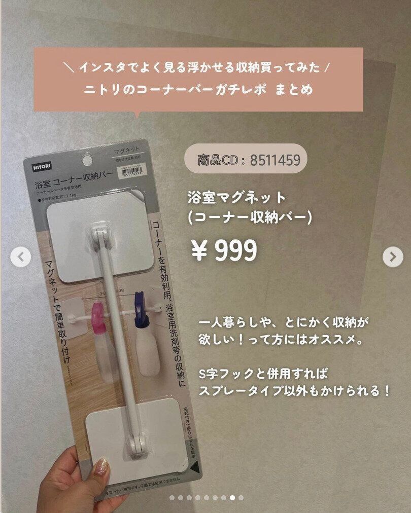 浴室にマグネットでつけるだけで簡単に「浮かせる収納」が増やせるのが、浴室マグネット(コーナー収納バー)、999円。強力な磁石で耐荷重は1kgあります。錆びないラバーマグネットなのもうれしいですね。マグネット部分は可動するため、自分の好きな角度で固定できますよ。