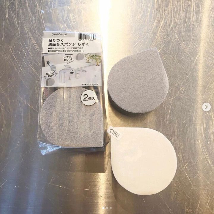 粘着テープで鏡やタイル、シンク内に浮かせておける、小さめのスポンジです。ツルツルした面にペタッとくっつくので、置き場に困らず簡単に水が切れるのがうれしいですね。マイクロ繊維が水アカや汚れをスッキリ落としてくれます。299円です。