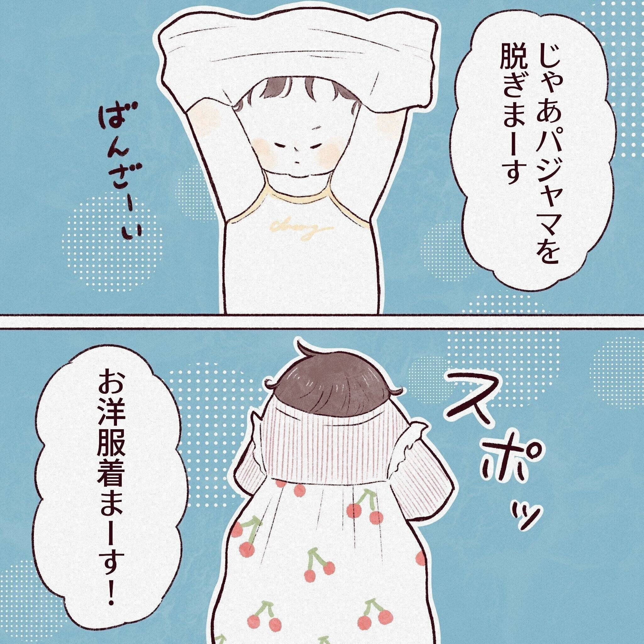 「パジャマを脱ぎまーす」「お洋服着まーす」の指示にも素直に応えてくれるたっちゃん。